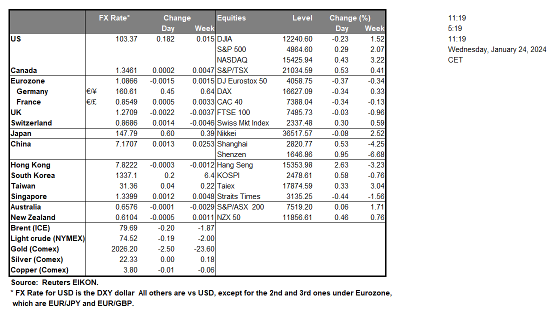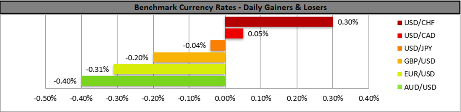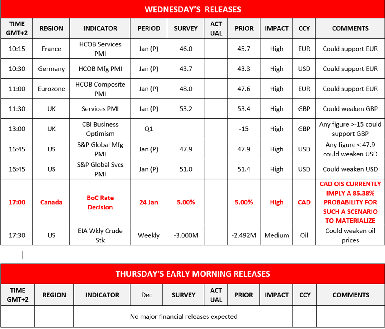 Today in the European session, we note the release of France’s Preliminary Service PMI figure, Germany’s Preliminary Manufacturing PMI figure the Eurozone’s preliminary composite PMI figure and the UK’s Preliminary Services PMI figure all for the month of January, followed by the UK’s CBI business optimism figure for Q1. During the American session, we note the release of the US S&P Preliminary Manufacturing and Services PMI figures for January and the US weekly EIA crude oil inventories figure. On a monetary level, we note the BoC’s interest rate decision is due out in tomorrow’s American session.