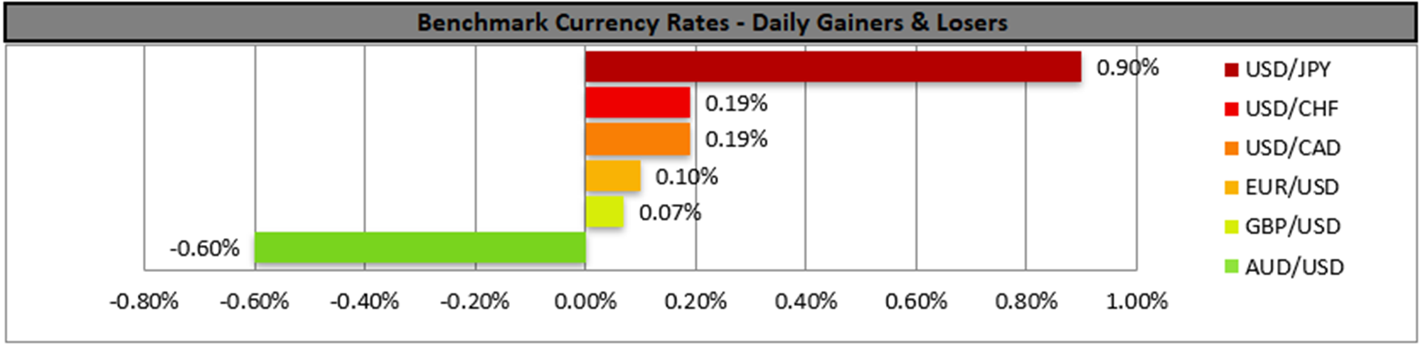 On a technical level, we note that the USD tended to gain against the EUR, as EUR/USD hit a ceiling at the 1.0960 (R1) resistance line. We have to note that the RSI indicator also tended to drop aiming for the reading of 30 and implying a built up of a bearish market sentiment as the price action moved lower. Yet for a bearish outlook we would require EUR/USD, to aim if not breach the 1.0835 (S1) support line and definitely reach a lower low. On the flip side should the bulls take over, we may see the pair breaking the 1.0960 (R1) resistance line and aiming for the 1.1065 (R2) resistance nest.