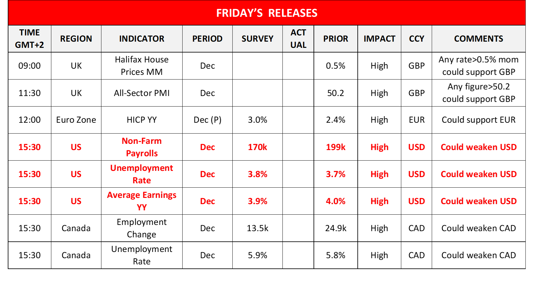 Today, we expect market attention to turn towards the release of the US employment report for December. The non-farm payroll figure is expected to drop to 170k from November’s 199k, the unemployment rate to tick up to 3.8% and the average earnings growth rate to slow down to 3.9% yoy from November’s 4.0% yoy. Should the actual rates and figures meet their respective forecasts, we may see the USD weakening, as all three indicators align in pointing towards an easing of the US employment market’s tightening. Such an easing may enhance the market’s expectations for the Fed to start aggressively cutting rates as early as March and even solidify market expectations for a total of six rate cuts in 2024. Overall, the release is expected to have a wider effect beyond major pairs in the FX market and US stockmarkets may get some support should the tightness of the US employment market ease, while a possible weakening of the USD could support gold’s price.