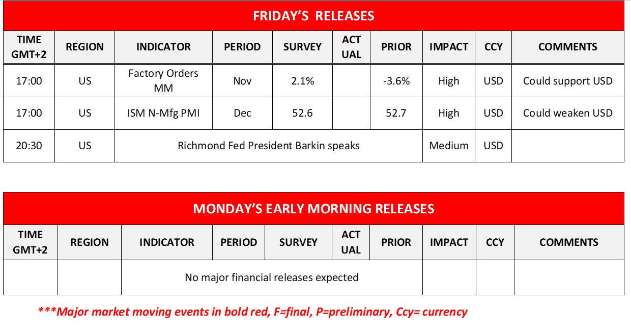 Today in the European session, we note the release of UK’s Halifax House prices and All sector PMI figure, both being for December and highlight the release of Eurozone’s preliminary HICP rate for the same month. In the American session we also note the release from the US of the Factory orders growth rate for November and the ISM non-manufacturing PMI figure for December, while on the monetary front, Richmond Fed President Barkin speaks.