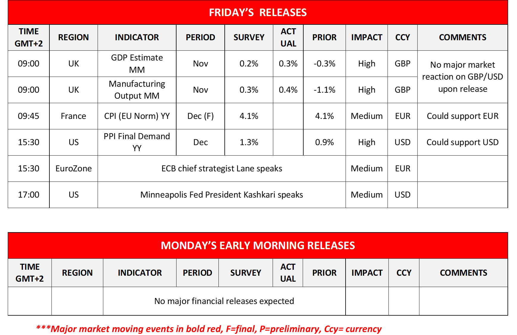 Today in the European session, besides the release of the UK GDP rates and manufacturing output growth rates for November we note the release of France’s final CPI (EU Normalised) rate for December. In the American session, we get the US PPI rate for December, while on the monetary front, we note that ECB chief strategist Lane and Minneapolis Fed President Kashkari are scheduled to speak.
