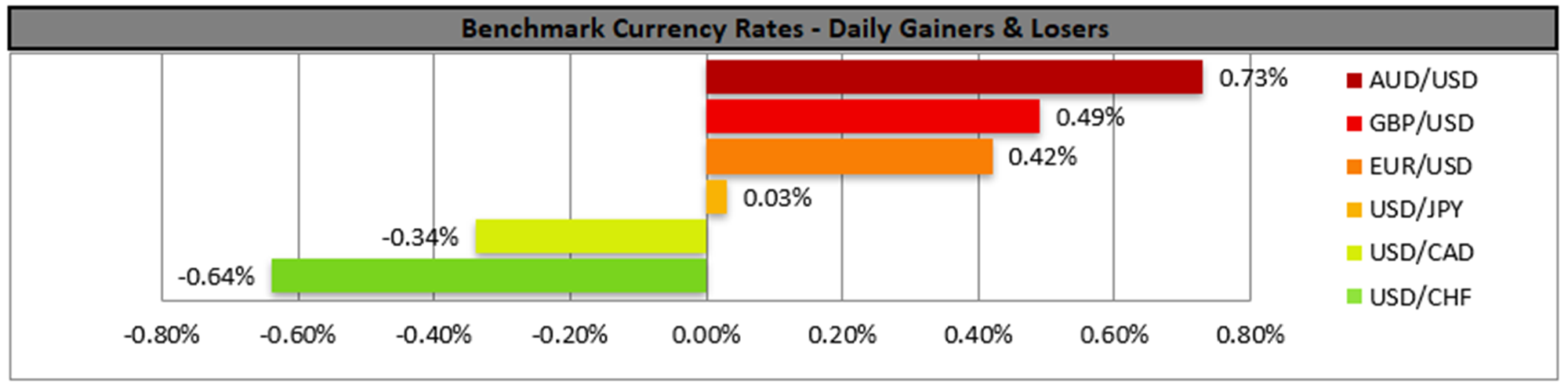 On a technical level the USD strengthened against the JPY yesterday and USD/JPY seems to have hit a ceiling on the 144.45 (R1) resistance line yesterday and retreated lower. We expect some stabilisation for the pair for the time being given that the RSI indicator remains near the reading of 50, implying a rather indecisive market. On the other hand, the upward trendline supporting the pair, seems to remain intact. Should the buyers regain control over USD/JPY’s direction, we may see it breaking the 144.45 (R1) resistance line clearly and aiming for the 146.30 (R2) resistance nest. Should the bears take over, we may see the pair breaking the prementioned upward trendline signalling an interruption of the upward movement, breach the 143.00 (S1) support line and aim for the 141.50 (S2) support level.
