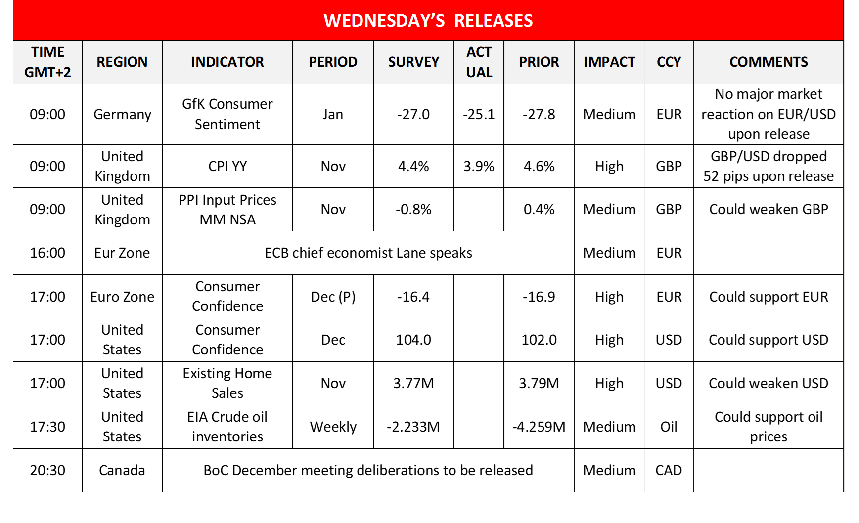 Today in the European session, we note the release of Germany’s GfK consumer sentiment for January. In the American session, we note the release of Eurozone’s preliminary consumer confidence for December, the US consumer confidence for the same month, and the US existing home sales for November. Oil traders on the other hand may be more interested in the release of the weekly EIA crude oil inventories figure while on the monetary front, we note that ECB’s chief economist Lane is scheduled to speak and BoC is to release the December meeting deliberations.