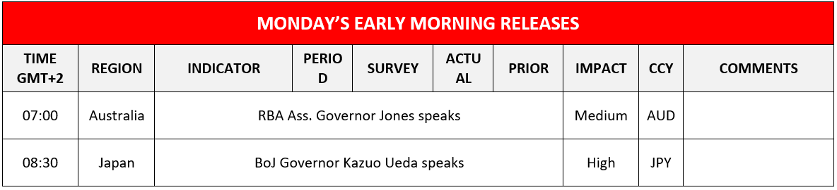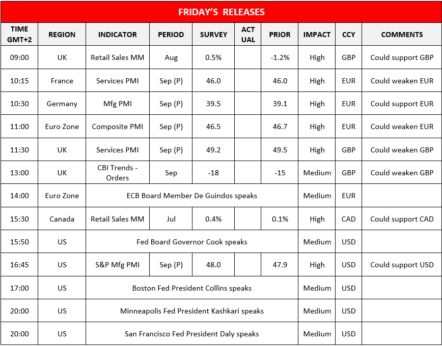 Today we note the release of the preliminary PMI figures for France, Germany, the Eurozone, the UK and the US for September, while from the UK we get August’s retail sales and September’s CBI industrial orders trend, while from Canada we get July’s retail sales growth rate. On the monetary front, we note that ECB Board Member De Guindos, Fed Board Governor Cook, Boston Fed President Collins, Minneapolis Fed President Kashkari and San Francisco Fed President Daly are scheduled to speak, while during tomorrow’s Asian session, we note that RBA Assistant Governor Jones and BoJ’s Governor Ueda are scheduled to make statements. It should be noted that JPY traders earlier today were in a selling mode for JPY as BoJ’s interest rate decision failed to provide any indications for a change in the bank’s ultra-loose monetary policy settings disproving any analysts hoping for a shift. Hence, we expect monetary policy outlook differentials to continue to weigh on JPY.