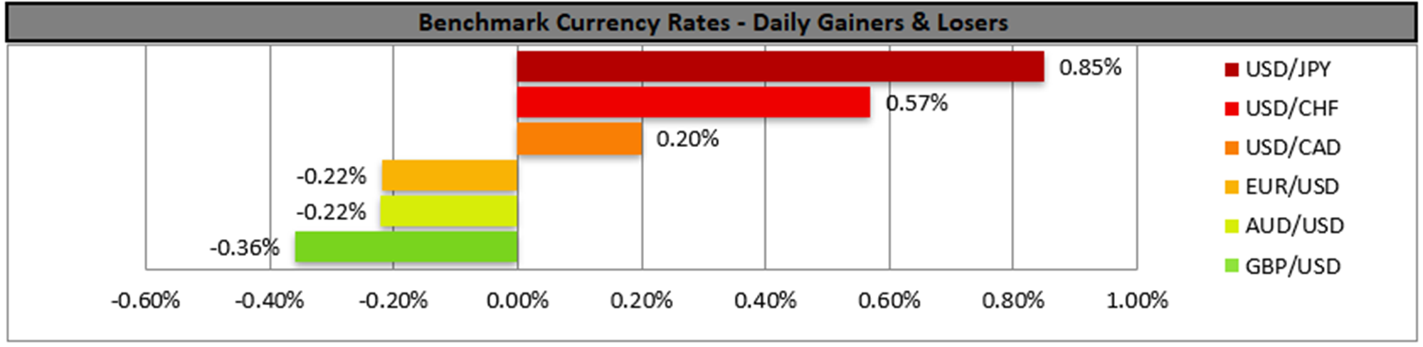 US stock markets on the other hand continued to send out mixed signals with S&P 500 edging lower, Nasdaq marking some gains and Dow Jones weakening. We see the case for the uncertainty of the markets to be maintained over the next 24 hours yet a possible rise of US yields and a rebound of oil prices may weigh on US equities markets.