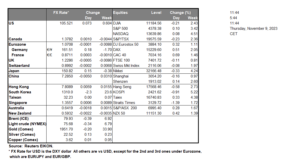 On a technical level, the EUR gained slightly against the dollar during yesterday’s trading session, having broken above our downwards-moving trendline which was incepted on the 6th of November. Despite the formation of a new upwards-moving trendline incepted on the 1st of November, we maintain a neutral outlook for the pair, and supporting our case is the RSI indicator below our 4-hour chart, which is currently fluctuating around the figure of 50, implying a neutral market sentiment. In addition, the narrowing of the Bollinger bands with the upper and lower bounds coinciding with the R1 and S1 levels, appear to further support our theory of a neutral market sentiment. As such for our neutral outlook to continue we would like to see the pair remaining between the 1.0665 (S1) support and the 1.0745 (R1) resistance levels. On the other hand, for a bearish outlook, we would like to see a clear break below the 1.0665 (S1) support level, with the next potential target for the bears being the 1.0535 (S2) support base. Lastly, for a bullish outlook, we would like to see a clear break above the 1.0745 (R1) resistance ceiling, with the next possible target for the bulls being the 1.0835 (R2) resistance ceiling.