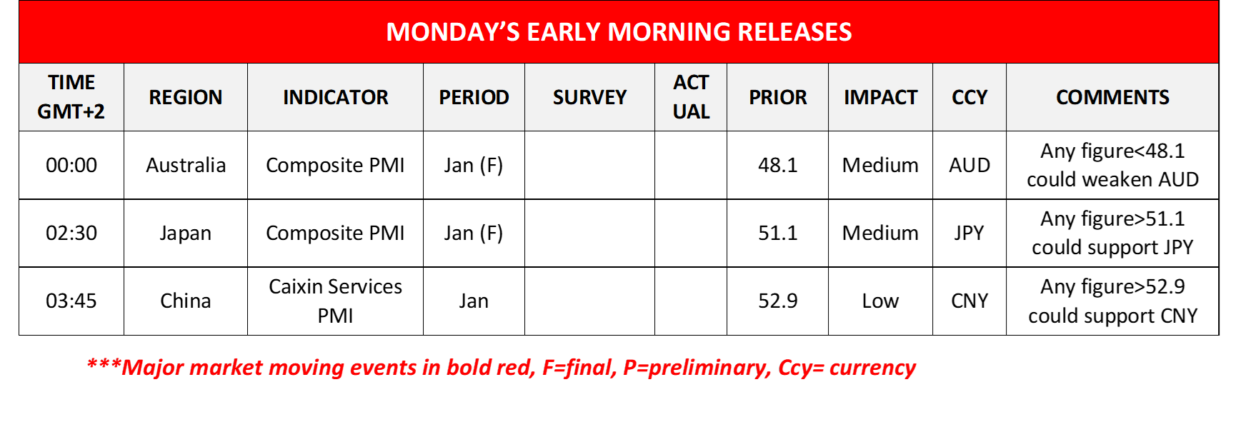 In today’s European session, we note the release of France’s industrial output for December, while on the monetary front, BoE’s chief economic Hugh Pill speaks. In the American session, besides the release of January’s US employment report, we also note the release from the US of the factory orders for December and the final University of Michigan consumer sentiment for January. During Monday’s Asian session, we note the release of Australia’s and Japan’s final composite and services PMI figures for January and China’s Caixin services PMI figure for the same month.