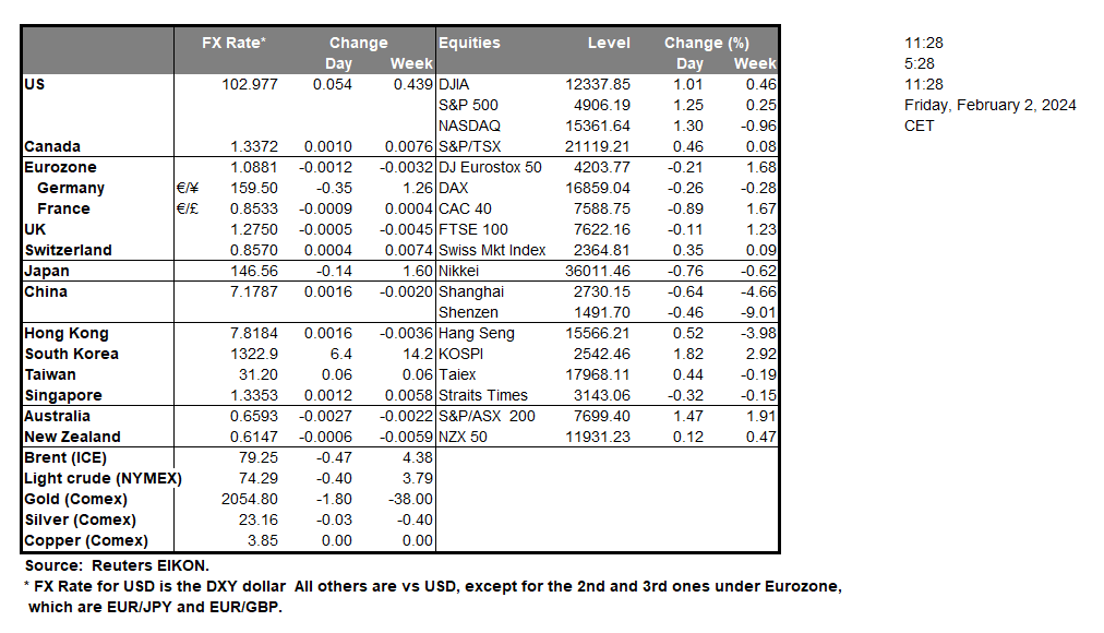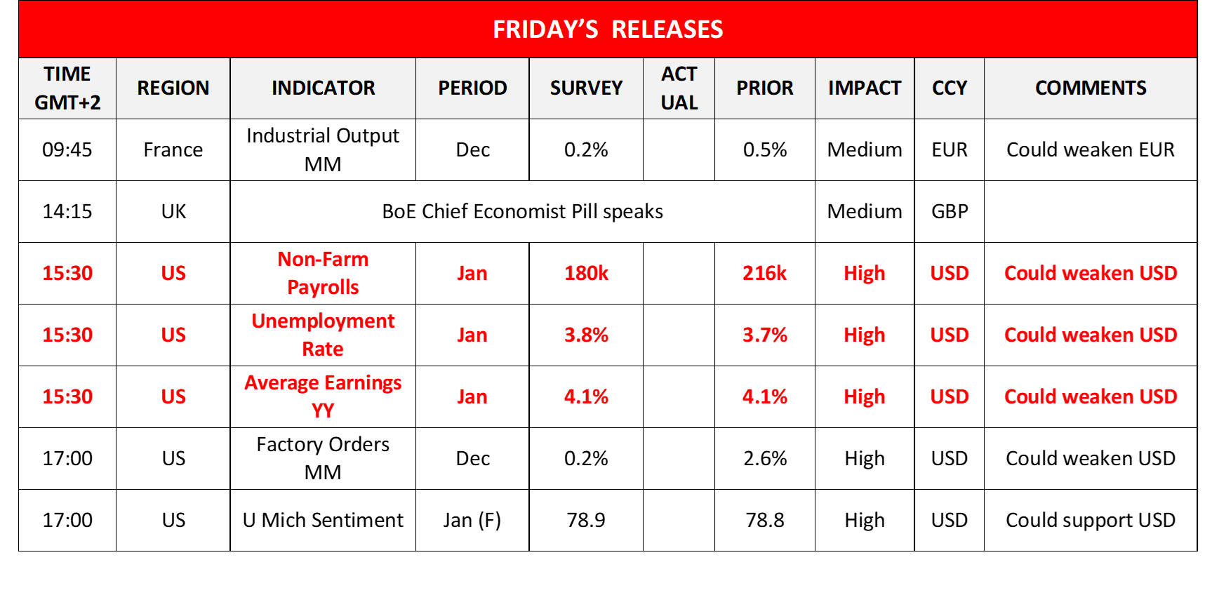 Volatility in the FX market picked up yesterday with the USD tumbling across the board, heading towards a weekly loss as the market eyes focus on the release of the US employment report for January, today in the American session. The non-farm payroll figure is expected to drop to 180k from December’s 216k, the unemployment rate to tick up to 3.8% and the average earnings growth rate to remain unchanged at 4.1% yoy if compared to December. Should the actual rates and figures meet their respective forecasts, we may see the USD weakening, as the rise of the unemployment rate and the drop of the Non-Farm Payroll figure point towards an easing of the US employment market’s tightening and thus disappoint USD traders. Such an easing may enhance the market’s expectations for the Fed to start aggressively cutting rates as early as May and even solidify market expectations for a total of six rate cuts in 2024. Overall, the release is expected to have a wider effect beyond major pairs in the FX market and US stockmarkets may get some support should the tightness of the US employment market ease, while a possible weakening of the USD could support gold’s price.