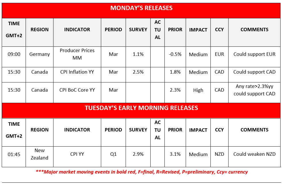 Tomorrow, Tuesday we get UK’s employment data for February and the US retail sales for March. On Wednesday, we get the UK CPI Rates for March, while in Turkey CBT is to release its interest rate decision.  On Thursday we get April’s preliminary PMI figures for the EuroZone, the UK and the US and on Friday we highlight Japan’s CPI rates for March.