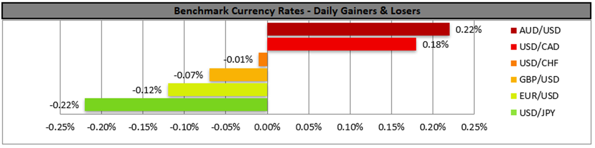 On a technical level, USD/CAD for the time being seems to continue higher as it has broken the 1.3660 (S1) resistance line, now turned to support. We tend to maintain our bullish outlook as long as the upward trendline continues to guide the pair, yet note that USD/CAD is threatening to break it, while the RSI indicator is nearing the reading of 50, implying an easing of the bullish sentiment of the market for the pair which in turn may allow the pair to stabilise somewhat. Should the pair find fresh, extensive buying orders along its path, we may see USD/CAD aiming for the 1.3800 (R1) resistance line. Should a selling interest be expressed by the market for the pair, we may see USD/CAD breaking the prementioned upward trendline, the 1.3660 (S1) support line and aim if not break the 1.3565 (S2) support level.