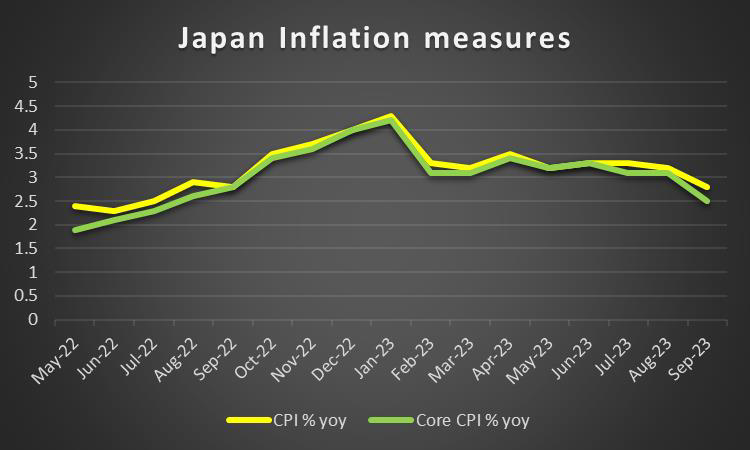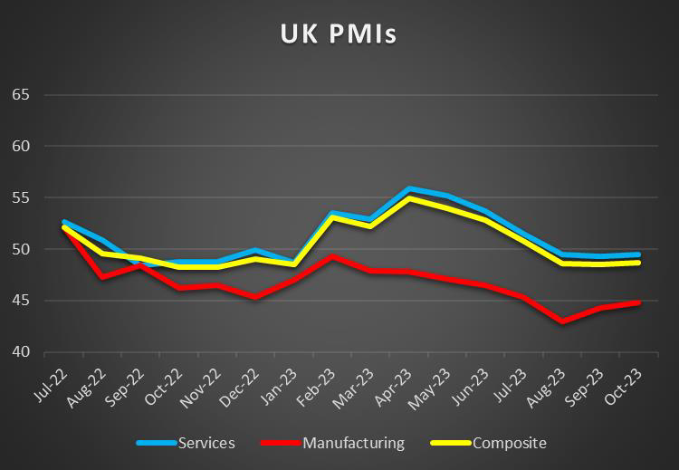 The pound is about to end the week higher against the USD and to a lesser degree against the JPY and the EUR. Overall though the movement could be perceived as a sign of strengthening of the pound. It should be noted that the pound strengthened despite the CPI rates slowing down more than expected, both at a core and a headline level. The slowdown is expected to solidify BoE’s decision to remain on hold, as the cumulative rate hikes seem to be working in slowing inflationary pressures in the UK economy. It should be noted though that BoE policymakers are highlighting the need for rates to remain high for a longer period, an idea that pushes against some market expectations for the bank to proceed with rate cuts earlier. Hence we may see pressures for the bank to proceed with another rate hike easing, yet the fact that the CPI rates are still way above the bank’s CPI target of 2% is forcing the bank to maintain the interest rates at high levels. On a macroeconomic level, we note that September’s employment data tended to show that the UK employment market remained tight, with the average earnings growth rate despite slowing down remained at relatively high levels, implying that the UK employment market may continue to support inflationary pressures in the UK economy.