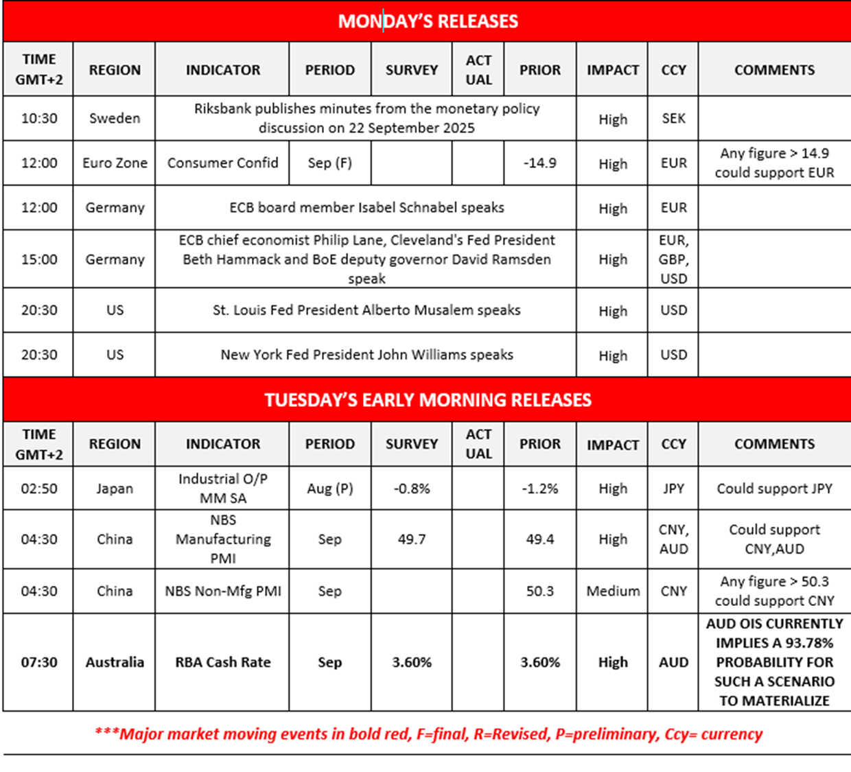 Today we note the release of the Eurozone’s final consumer confidence figure for September, and in tomorrow’s Asian session we note Japan’s preliminary industrial output rate for August, China’s NBS manufacturing and non-manufacturing PMI figures for September. On a monetary level we note the release of the Riksbank’s last monetary policy meeting minutes, the speech by ECB Schnabel, the joint speech by ECB Chief Economist Lane, Cleveland Fed President Hammack and BoE Deputy Governor Ramsden, St Louis Fed President Musalem and New York Fed President Williams.