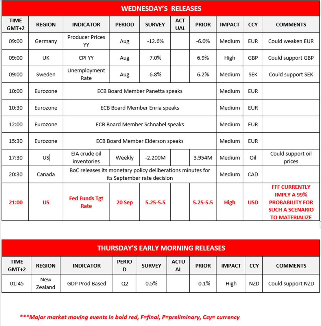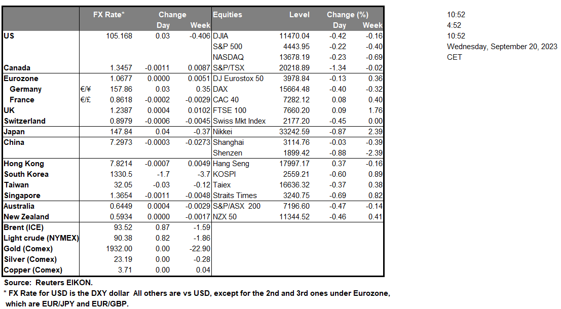 The Fed’s interest rate decision is due out today, with the majority of market participants anticipating that the Fed will remain on pause, amidst the backdrop of the US housing starts figure dropping to the lowest point since 2020, painting a worrying sign for the US economy. In addition, the US House of Representatives passed a measure that would temporarily increase the Government’s spending ability whilst avoiding a government shutdown, yet the Senate Majority leader Schumer, stated that the bill would be “dead” on arrival, thus potentially resulting to a second round between Republicans and Democrats in a government shutdown scenario. In Canada the BOC Core CPI rates came in higher than expected, hinting at persistent inflationary pressures in the Canadian economy, which could increase pressure on the bank to resume its rate hiking cycle and as such could provide support for the CAD. Over in the UK, the CPI rates for August edged lower, hinting at easing inflationary pressures in the UK economy as the BOE prepares to meet to discuss its next interest rate decision. The lower-than-expected CPI rates could potentially ease pressure on the bank should they wish to adopt a more dovish tone or should the decide to remain on pause, albeit an unlikely scenario. In the commodities markets, the liquid gold appears to be halting its upwards trajectory, despite the API weekly oil inventories reporting a wider than expected drawdown of the US oil inventories. In Europe, ECB’s Villeroy stated that “The ECB is not at the point today where we could cut rates”, hinting that the current interest rates will remain at current levels for a prolonged period of time, which could provide support for the common currency in the long run if the ECB’s counterparts cut rates earlier. Lastly, we note the increasing tensions between Poland and Ukraine over Poland’s ban on Ukrainian grain, as such should the ban be lifted and an influx of grain is seen in Europe, we may see the price of Wheat moving to lower ground.