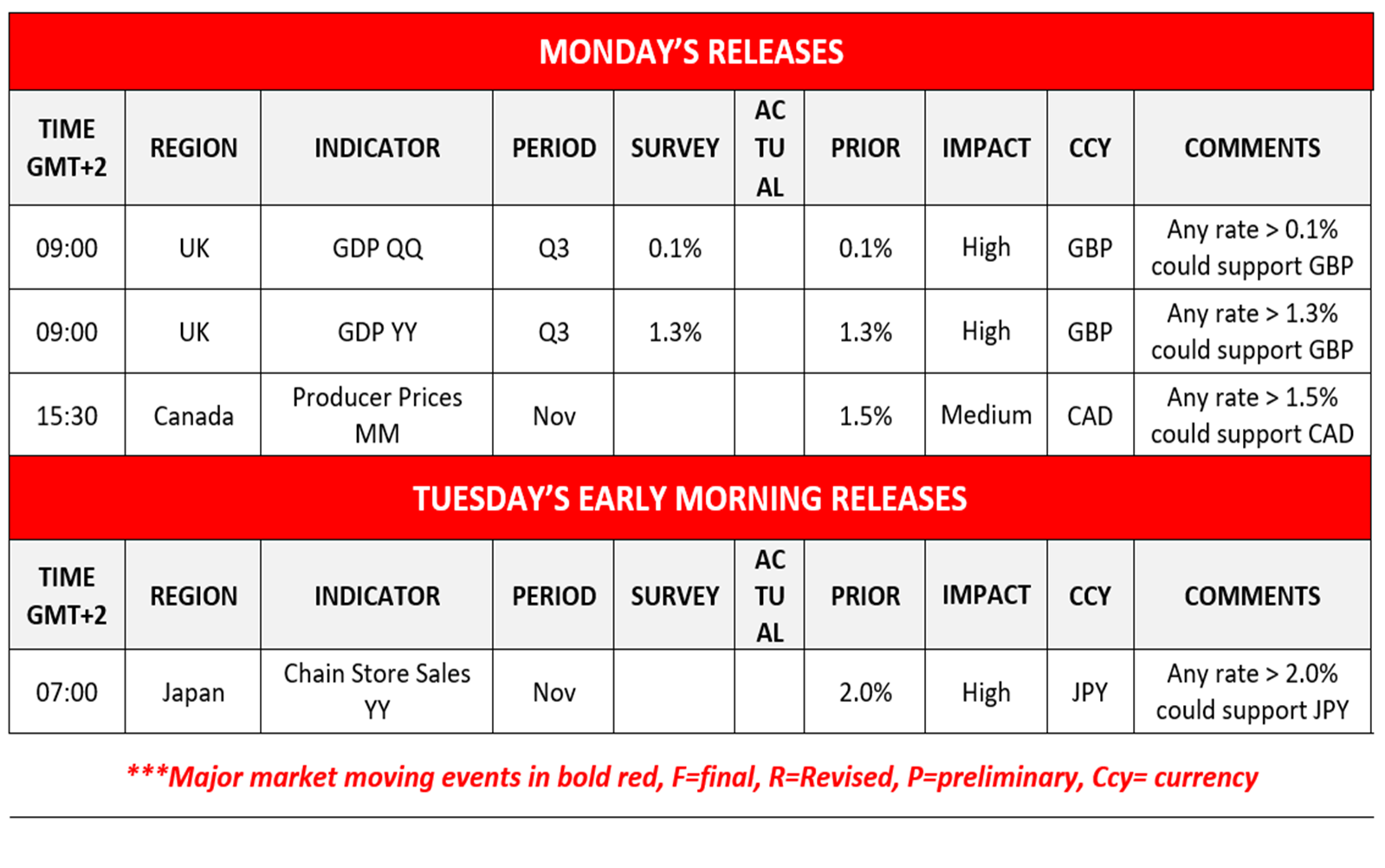Today, we get the UK’s GDP rates for Q3 and Canada’s producer prices rate for November during today’s American trading session. In tomorrow’s Asian session, we note Japan’s November chain stores sales rate.