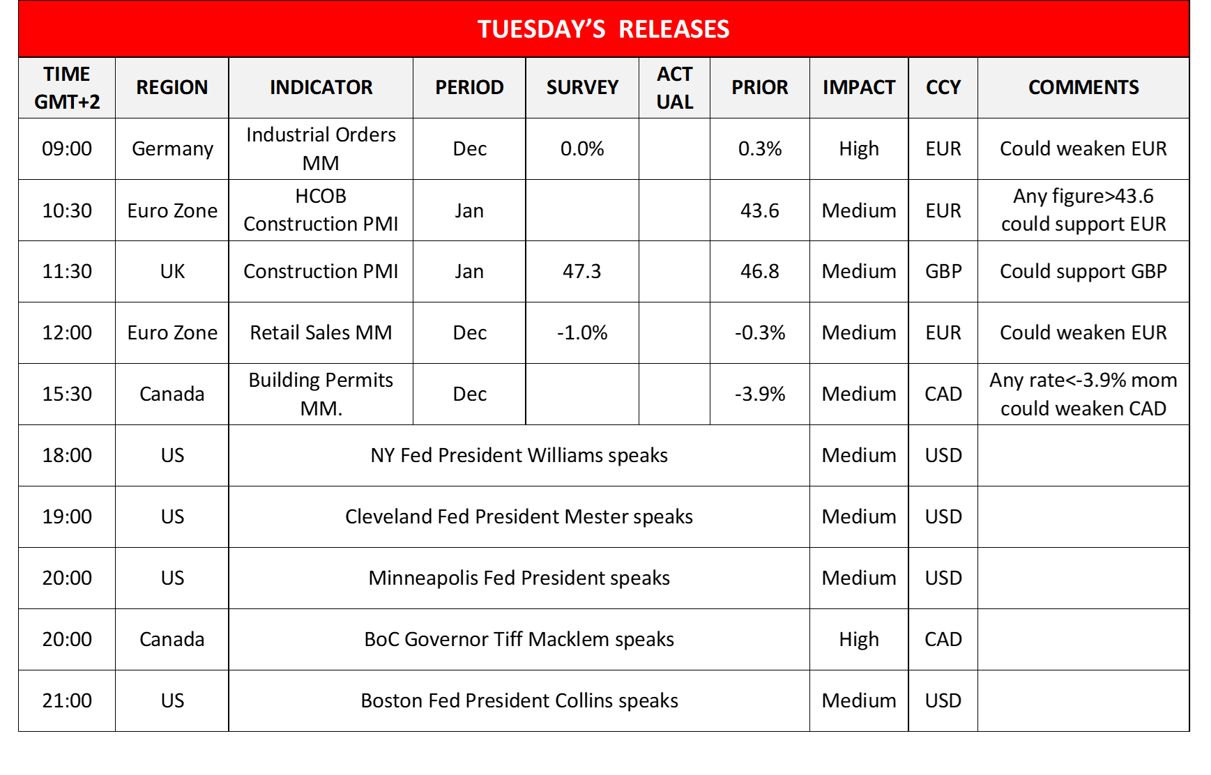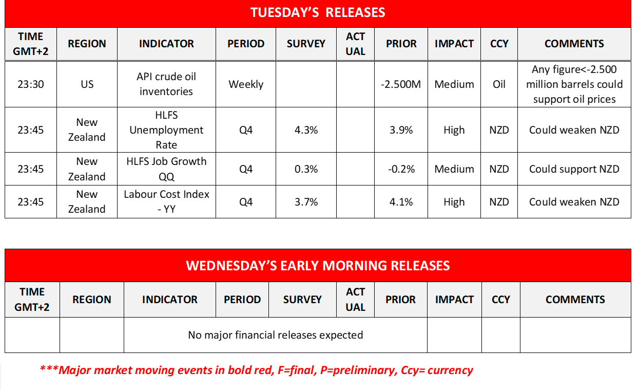 We note in the European session, the release of Germany’s industrial orders for December, Eurozone’s and the UK’s January Construction PMI figures and Eurozone’s December retail sales. In the American session, we note the release of Canadas’ building permits for December, while later on oil traders may be more interested in the release of API weekly crude oil inventories figure and Kiwi traders in New Zealand’s Q4, employment data. On the monetary front, note that NY Fed President Williams, Cleveland Fed President Mester, Minneapolis Fed President, BoC Governor Tiff Macklem and Boston Fed President Collins are scheduled to speak.