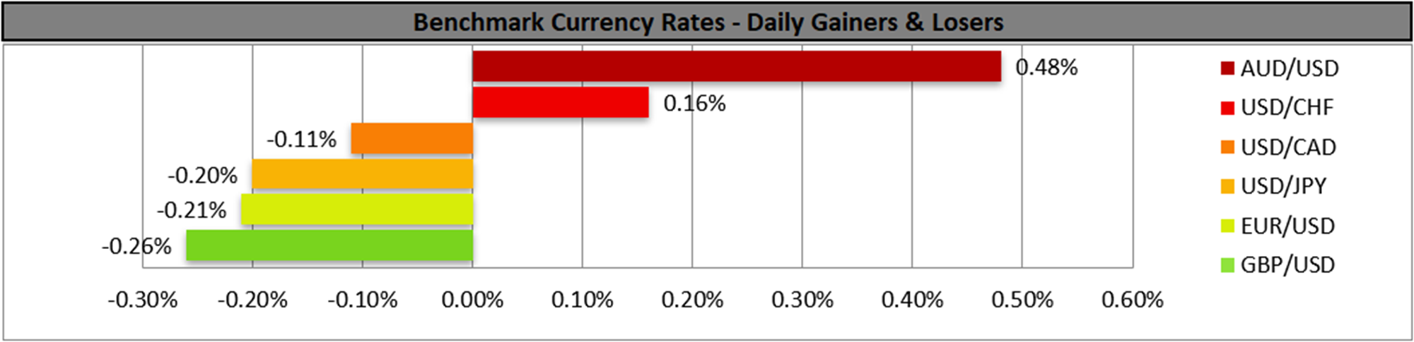 USD/CAD seems to remain close to the 1.3880 (S1) support line. We tend to maintain a bullish predisposition of the pair as the upward trendline is still valid, yet the pair’s sideways motion of the past three days is putting the upward trendline to the test, hence we issue along the bullish outlook also a warning for a possible stabilisation of the pair. Also the RSI indicator remains above the reading of 50, implying a rather weak bullish market sentiment for the pair. Should the bulls remain in charge, we may see the pair aiming for the 1.4020 (R1) resistance line. Should the bears take over, we may see the pair breaking the prementioned upward trendline, the 1.3880 (S1) support line and start aiming for the 1.3720 (S2) support level.