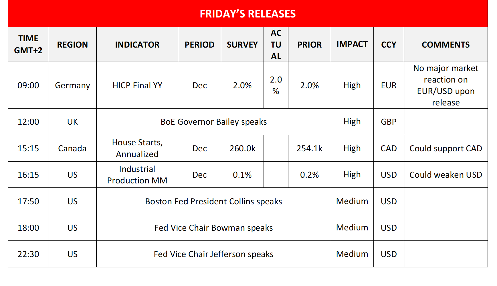 Also, we note the slight weakening of the CAD after the sharp drop in oil prices yesterday, a scenario that we had warned about in yesterday’s report. The Loonie is sensitive to the level of oil prices as Canada is a major oil-producing economy. Also, macroeconomic data showed that manufacturing sales, wholesale trade and building permits were all in the red. On a fundamental level, Canadian PM Carney is on tour in China trying to improve Sino-Canadian trade relationships, which could provide some support for the Loonie if materialized, while we also note the release of Canada’s number of House starts for December, today, while the next big test for the Loonie is to be the release of Canada’s CPI rates for December on Monday.