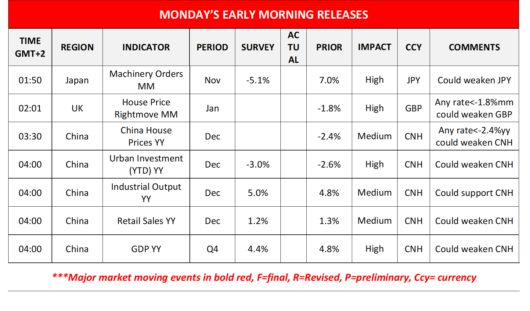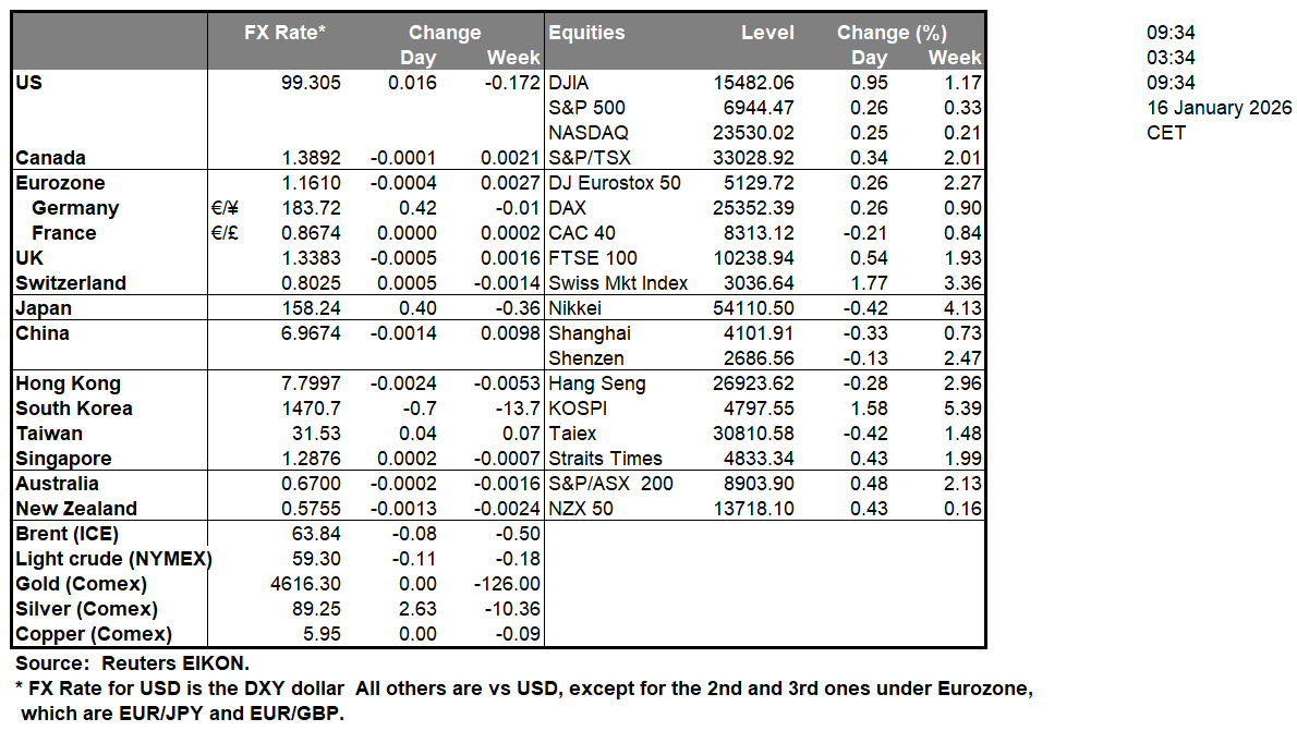 JPY gained against the USD, the EUR and GBP in today’s Asian and early European sessions, as the possibility of a joint US-Japanese market intervention was floated by Japan’s Finance Minister Satsuki Katayama. She stated that Japan is not to rule out any options while also stated that the joint US-Japanese statement issued last September “was extremely significant and included language on intervention“. It should be noted that USD/JPY in the past few days reached highs not seen since early July last year, indicative of JPY’s weakness. We regard the possibility of a market intervention as high, yet at the same time, we highlight that the fundamentals surrounding the Japanese currency continue to create headwinds for the Yen. We note Japan’s PM Takaichi’s intentions to dissolve the lower House of the Diet and call for a snap election, which tends to weigh on JPY given the Japanese Government’s stance against the hiking intentions of BoJ and the possible political uncertainty emerging in the land of the rising sun. Developments on the issue are expected on Monday morning as Ms. Takaichi is expected to proceed with relevant announcements.
