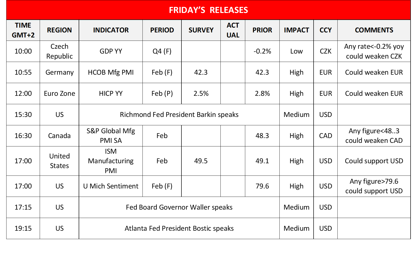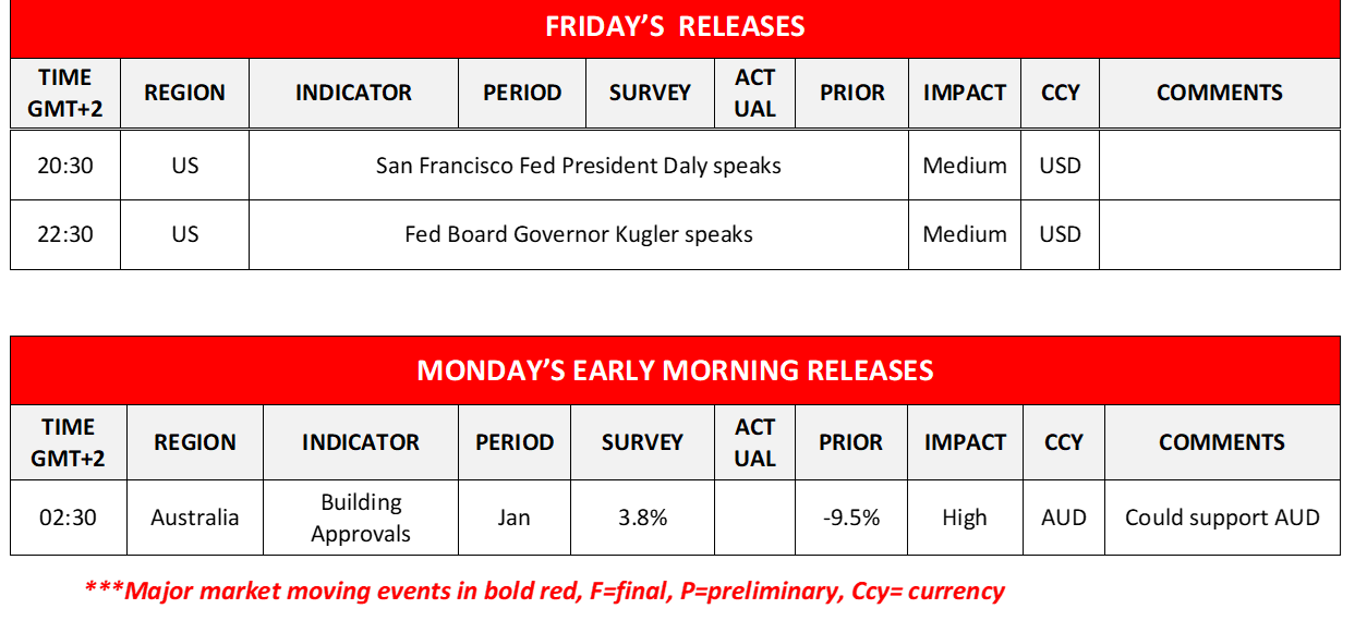 Today in the European session, we note the release of the Czech Republic’s final GDP rate for Q4 and Germany’s final manufacturing PMI figure for February. In the American session, we get Canada’s manufacturing PMI figure and from the US the final UoM consumer sentiment, both for February. On the monetary front, we note that Richmond Fed President Barkin, Fed Board Governor Waller, Atlanta Fed President Bostic, San Francisco Fed President Daly and Fed Board Governor Kugler speak. During Monday’s Asian session, we get Australia’s building approvals growth rate for January.