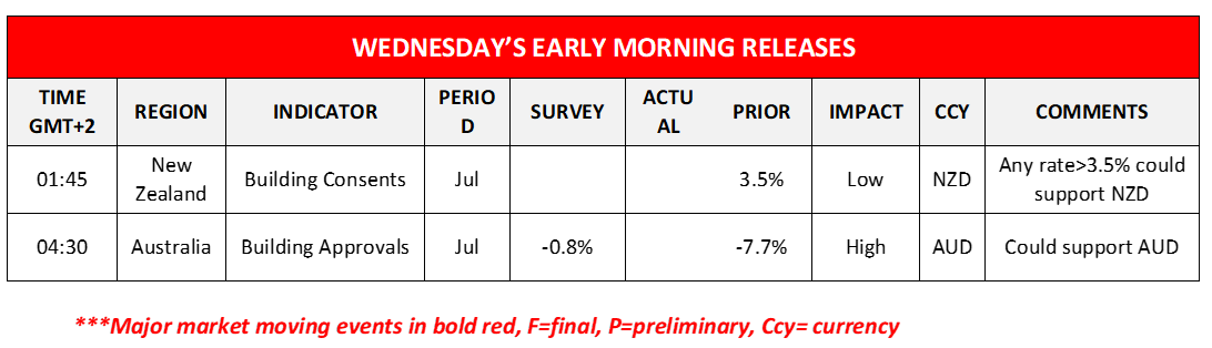 During today’s European session, we note the release of the GDP rates for Q2 of Norway and Sweden, while RBA Deputy Governor Bullock is scheduled to speak. In the American session, we note the release from the US of the Consumer confidence for August and the JOLTS job openings figure for July, while Fed Vice Chair Barr speaks. Oil traders, on the other hand, may be more interested in the release of the US API weekly crude oil inventories figure. During tomorrow’s Asian session, we note the release of New Zealand’s and Australia’s building approvals growth rates, both being for July.