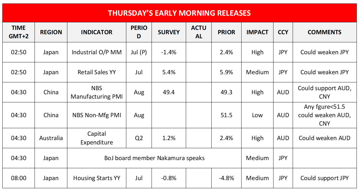 Today, we note the release of Switzerland’s KOF indicator and Eurozone’s economic sentiment both for August and later the from the US the EIA crude oil inventories figure. During tomorrow’s Asian session, we note the release from Japan of the preliminary industrial output, retail sales and housing starts growth rates for July, while BoJ board member Nakamura speaks.