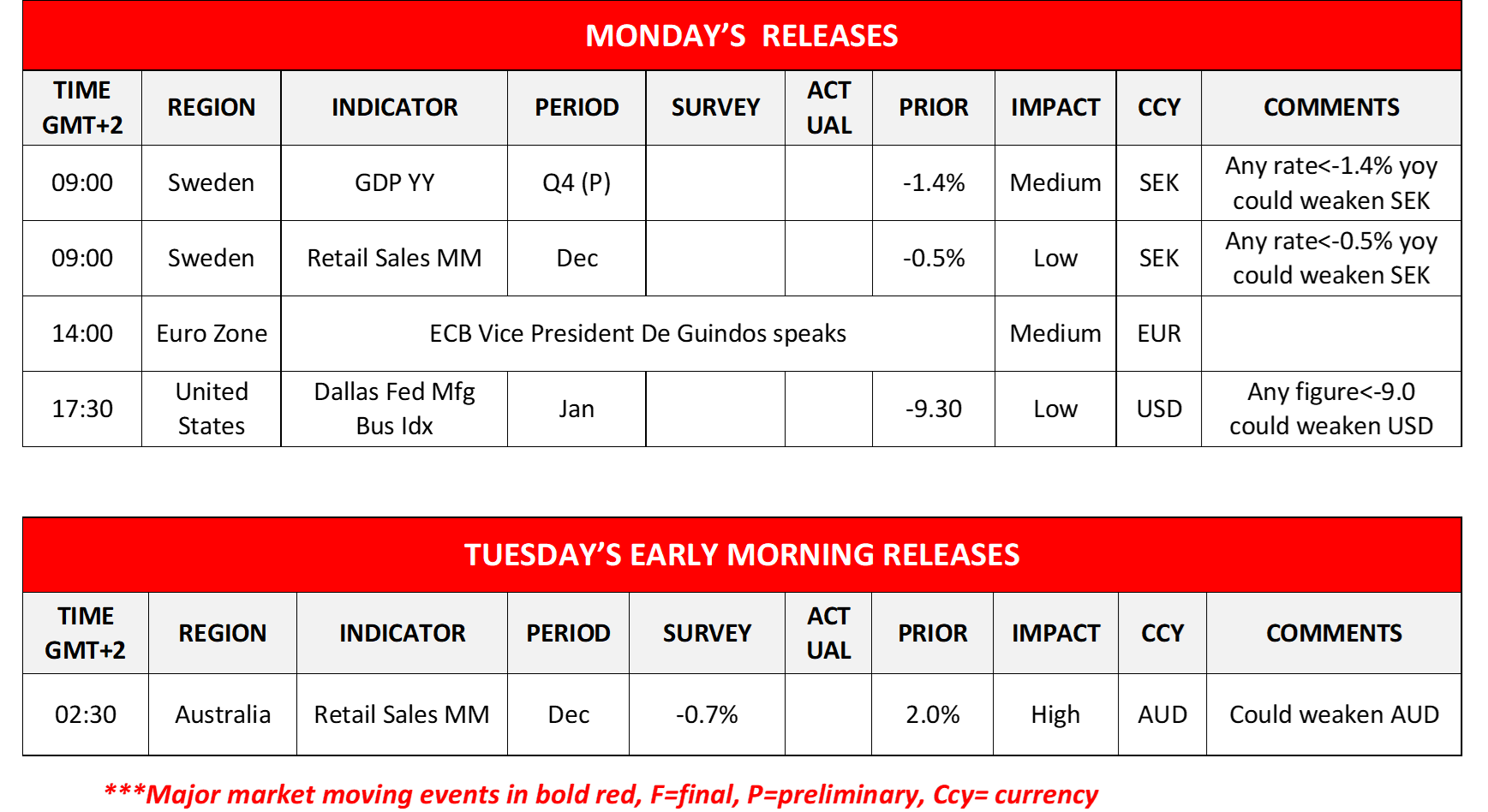 In an easy-going Monday, we note in the European session, Sweden’s preliminary GDP rate for Q4 and retail sales for December, while on a monetary level, we note that ECB Vice President De Guindos is scheduled to speak. In the Asian session tomorrow, we note the release of Australia’s retail sales growth rate for December.