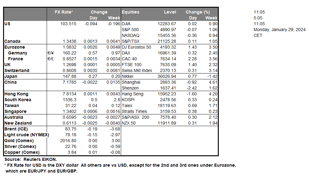 On Tuesday we get Q4’s preliminary GDP rates of France, the Czech Republic, Germany and the Eurozone, and Switzerland’s KOF indicator, Eurozone’s economic sentiment for January and from the US the December JOLTS Job Openings. On Wednesday we begin with the release of Japan’s industrial output for December, Australia’s CPI rates for Q4, Chinas’ NBS manufacturing PMI figure for January, UK’s nationwide house prices for January, France’s and Germany’s preliminary HICP rates for January, the US ADP national employment figure for January and Canada’s GDP rates for November and we highlight the release of the Fed’s interest rate decision. On Thursday we note the release of Australia’s building approvals for December, China’s Caixin manufacturing PMI figure for January, Eurozone’s preliminary HICP rates for January, the US weekly initial jobless claims figure, Canada’s manufacturing PMI figure for January and the US ISM Manufacturing PMI figure for January and on a monetary level, we note the interest rate decisions of BoE and Riksbank. On Friday we highlight the release from the US of the employment report for January and the factory’s orders for December and the final UoM consumer sentiment for January.