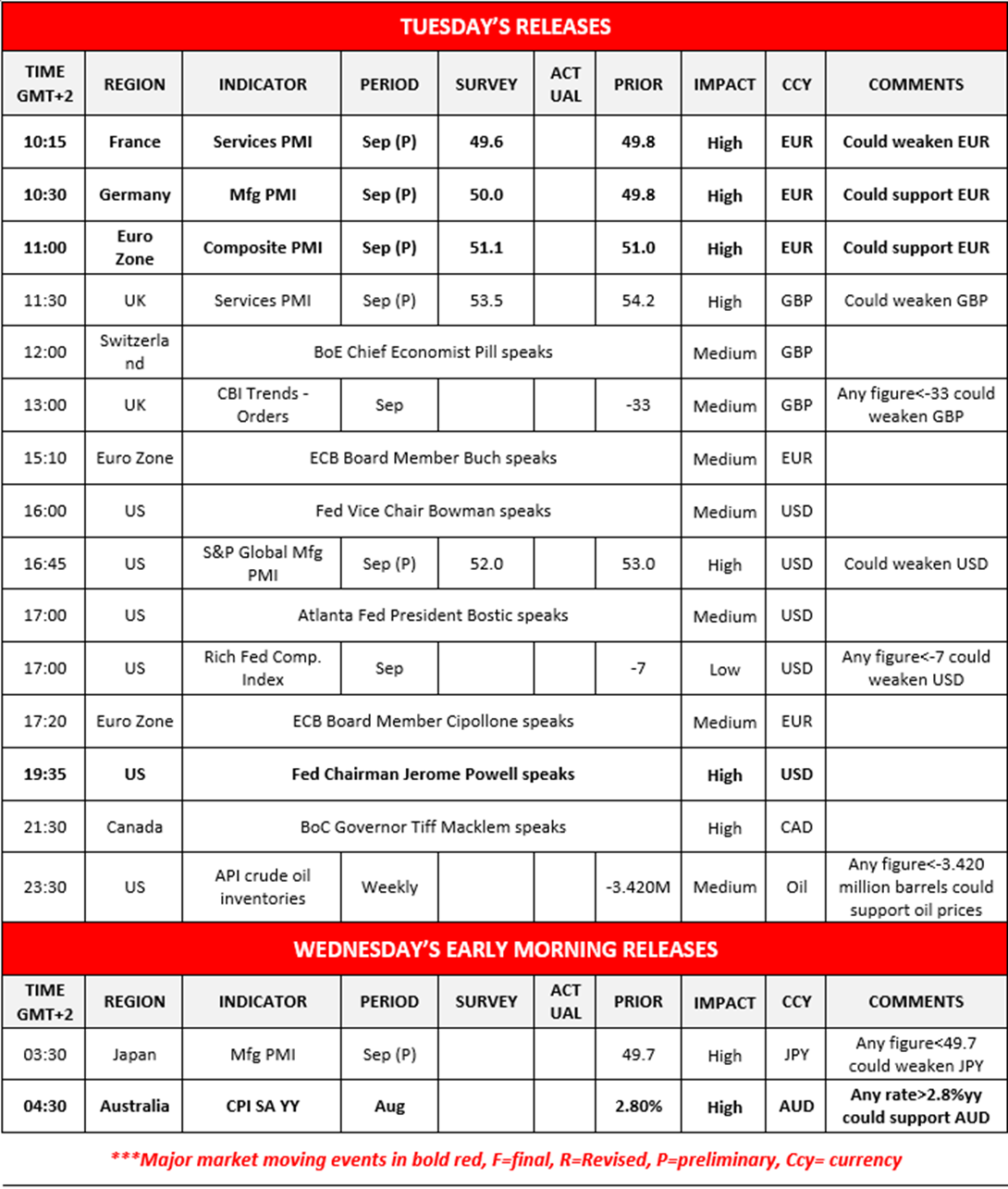Today we note the release of Canada’s PPI rates for August and Euro Zone’s preliminary consumer confidence for September. On a monetary level, we note that BoE Chief Economist Pill, NY Fed President Williams, St. Louis Fed President Musalem, Richmond Fed President Barkin, Cleveland Fed President Hammack, BoC Senior Deputy Governor Rogers, BoE Governor Andrew Bailey and BoC Deputy Governor Kozicki are scheduled to speak. In tomorrow’s Asian session, we get Australia’s manufacturing PMI figure for September.