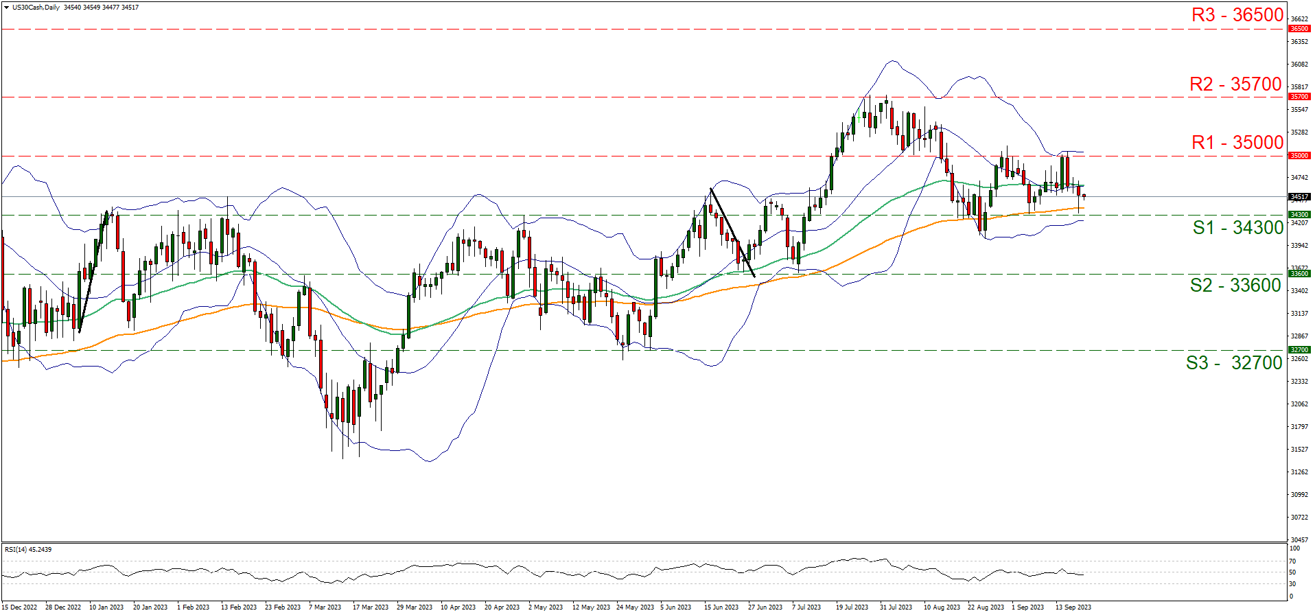 Dow Jones in the big picture tended to remain confined in a sideways motion between the 34300 (S1) support line and the 35000 (R1) resistance level, despite an unconvincing drop on the 15th of the month. We tend to maintain our bias for the sideways motion to continue as long as the price action largely respects the prementioned levels. We note that the RSI indicator runs just below the reading of 50, currently implying a rather indecisive market, while the Bollinger Bands have narrowed implying lower volatility, with both indicators implying that a continuance of the sideways motion may be allowed. Nevertheless, we highlight that the Fed’s interest rate decision may alter the direction of the index. Should the bulls take over we may see the index breaking the 35000 (R1) resistance line, a level forming the upper boundary of the current sideways motion and aim for the 35700 (R2) resistance level, which reversed the index’s upward motion in the last days of July, while we note as the ultimate possible target for the bulls the 36500 (R3) resistance barrier that has not seen any price action since January last year. Should the bears be in charge, we may see the index breaking the 34300 (S1) support base that also is considered the lower boundary of the index’s current sideways motion and aim for the 33600 (S2) support level, that held its ground against downward pressure of the index on the 26th of June and 1st of July. As the final support line we note the 32700 (S3) support hurdle that served the index well as a support line in the last days of May.