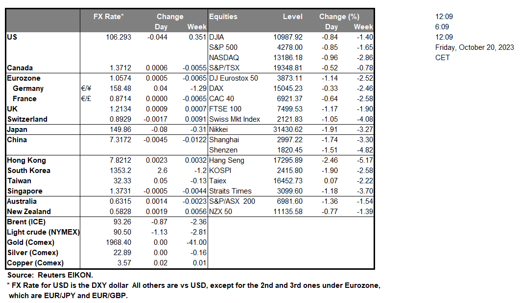 The USD tended to weaken against its counterparts yesterday with Fed Chairman Powell’s speech feeding the bearish sentiment further. We note that Powell despite not actually committing to any form of action noted that inflation is still too high and that Fed policymakers are united in the effort to bring inflation back to the bank’s 2% target. Nevertheless, the Fed Chairman acknowledged the progress made so far. At this point, it should be added that US Bond yields continued to rise, with the 10-year yield at some point nearing 5% a level not seen in 16 years.
