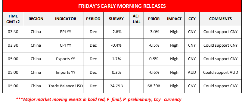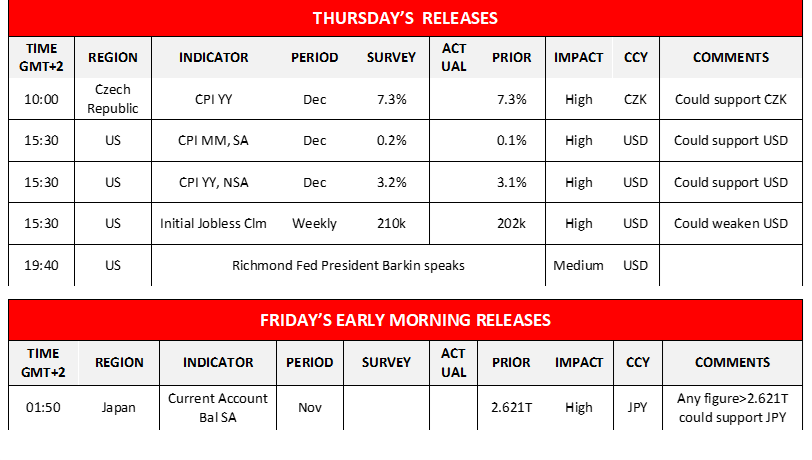 Today in the European session we note the release of the Czech Republic’s CPI rates for December. In the American session, besides the US CPI rates, we also note the release of the weekly initial jobless claims figure, while on the monetary front, Richmond Fed President Barkin is scheduled to speak. During tomorrow’s Asian session we get from Japan the Current account balance for November and from China we get the inflation metrics and trade data, both being for December.