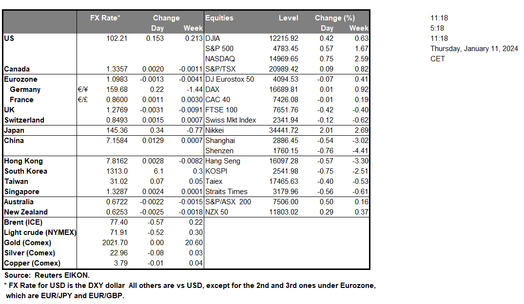 The USD edged lower yesterday against its counterparts, yet the relative stabilisation of the greenback over the past week seems to be maintained as the market focuses on the release of the US CPI rates for December.  The headline rate is expected to tick up to 3.2% on a yearly level while the core rate is expected to slow down to 3.8% yoy if compared to November’s 4.0% yoy. Overall, should the actual rates meet their forecasts we may see them sending some mixed signals about inflationary pressures in the US economy. Yet there seems to be some hesitation for the CPI rates to slow down which partially is understandable given the Christmas period. Yet if such CPI rates are combined with the stronger-than-expected US employment report for the same month, the release, if expectations are realised or are even higher, the release may allow the Fed to delay any rate cuts in contrast to the market expectations and thus provide some support for the USD. On the other hand, we have to note that December’s US employment report which theoretically should also support the USD did not have a lasting effect, indicative of a market that sticks firm to its expectations despite warnings from Fed officials. Please note that the release may have wider effects beyond the FX market, and a possible acceleration of December’s CPI rates could weaken US stock markets and gold’s price.