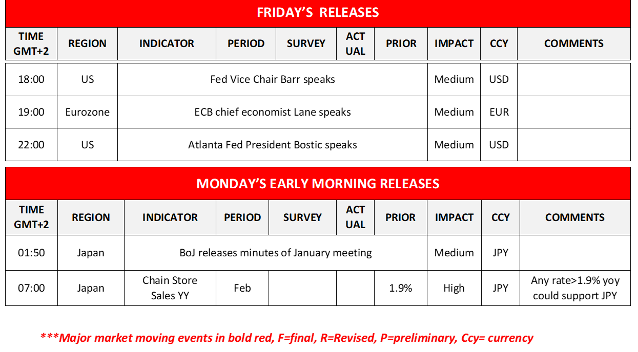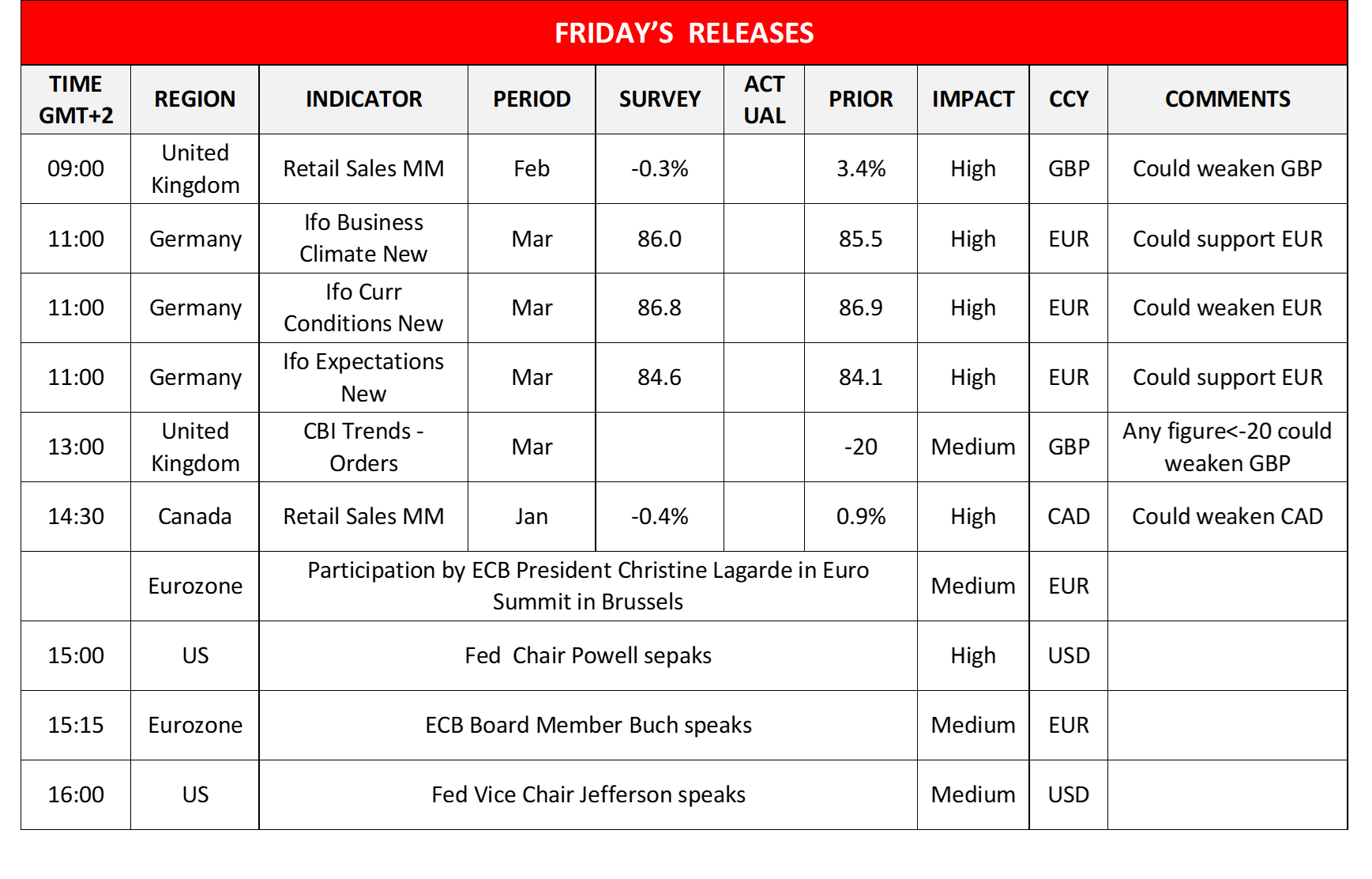 Today in the European session, we note the release of the UK’s retail sales for February and CBI trends for industrial orders for March. From Germany, we get March’s Ifo indicators, while in the American session, we get Canada’s retail sales for January. On the monetary front, we highlight Fed Chairman Powell’s speech while ECB Board Member Buch, Fed Vice Chair Jefferson, Fed Vice Chair Barr, ECB Chief Economist Lane and Atlanta Fed President Bostic are scheduled to speak. During Monday’s Asian session, we get Japan’s Chain Store Sales for February while BoJ is to release the minutes of its January meeting.