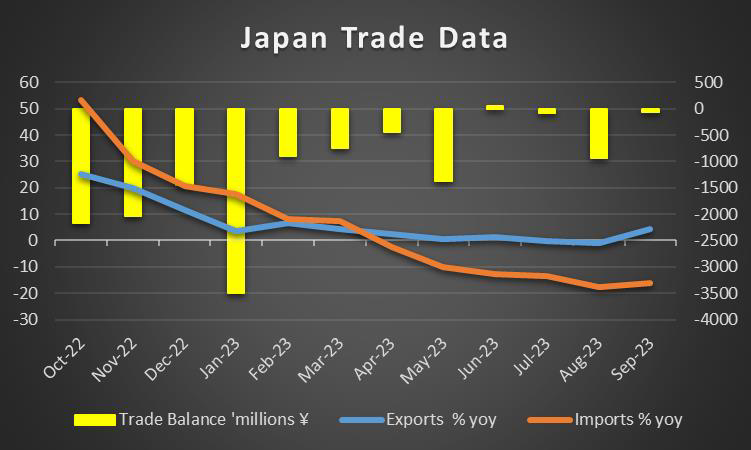The USD seems about to end the week in the greens, regaining some of last week’s losses. On the monetary front we note that Fed Chairman Powell along with other Fed policymakers expressed some uncertainty on whether the Fed’s tightening is enough to combat inflationary pressures in the US economy. The statements come one week after the bank decided to pause its rate hiking path and were perceived as leaning on the hawkish side by the market. Nevertheless, we note that the market’s expectations that the bank has reached its terminal rate and may proceed with a rate cut in early summer next year seem to remain present, yet any further hawkish comments may contradict them and provide support for the USD. On a political level, we note that the possibility of a US government shutdown looms and in the next week we may see discussions for the issue arising and affecting the USD. On a deeper fundamental level, market worries for a slowdown of the US economy tend to persist to some degree. On a macro-economic level, we note that October’s US employment report showed some cracks in the US employment market. The US economy added 150,000 jobs in October, shy of the estimated 180,000, the unemployment rate ticked up to 3.9% from 3.8%, and wage growth slowed. The release tended to solidify the market’s expectations for the Fed to remain on hold and understandably weakened the USD. The next big test for the greenback is expected to be the release of the US CPI rates for