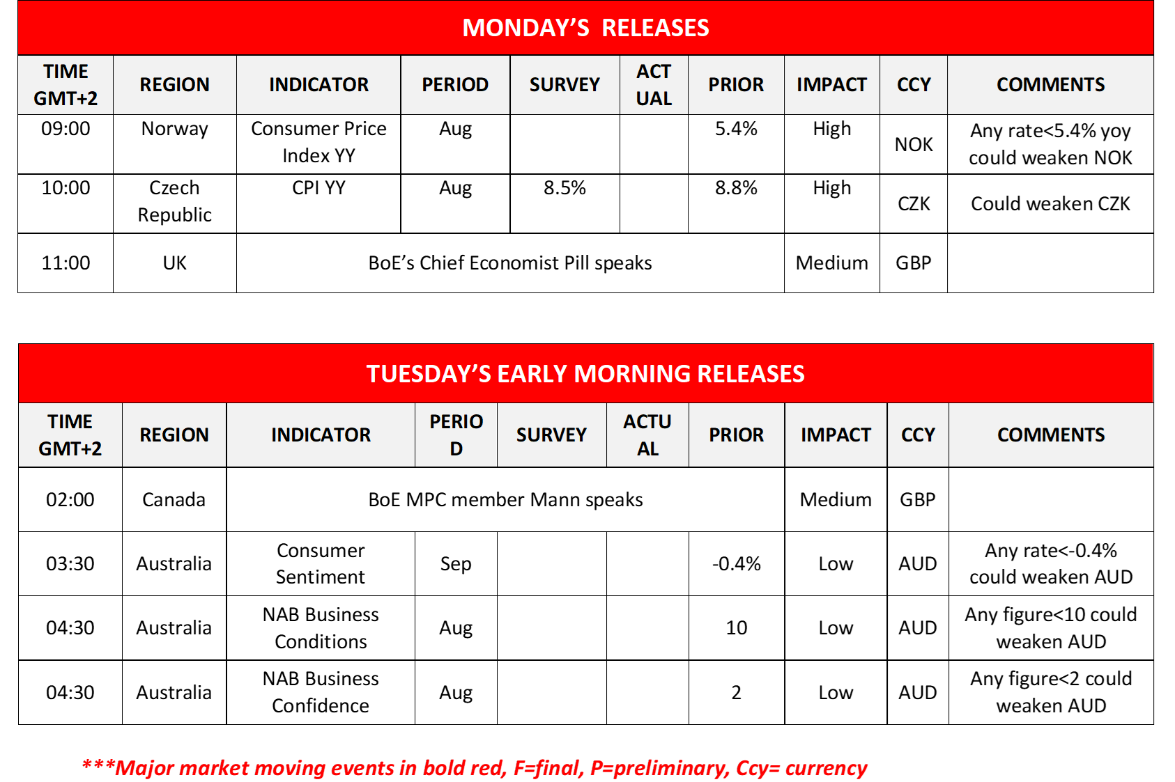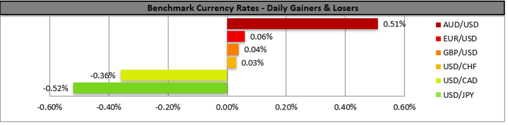 We note in the European session today the release of Norway’s and the Czech Republic’s CPI rates for August. During tomorrow’s Asian session, we note the release of Australia’s consumer sentiment of September and business indicators for August. On the monetary front we note for GBP traders that BoE’s Chief Economist Pill and BoE MPC member Mann speak.