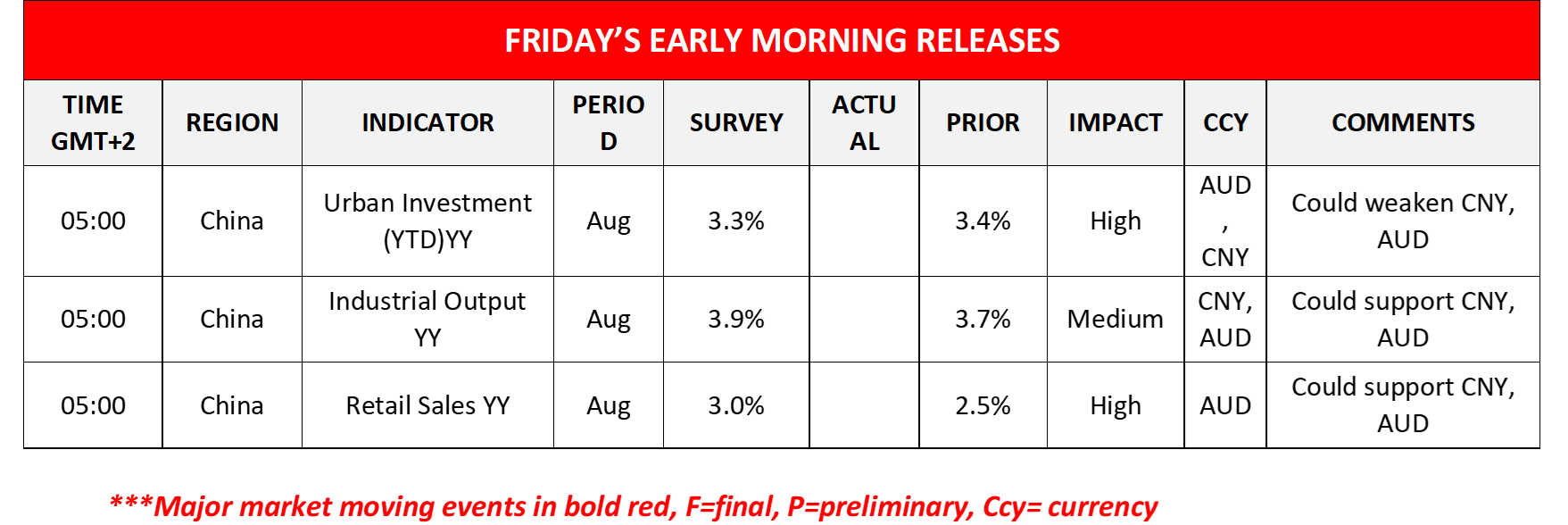 In today’s European session, we get Sweden’s CPI rates for August and in the American session, we note the release of the US weekly initial jobless claims figure, August’s PPI rates and retail sales and from Canada we get July’s wholesale trade. During tomorrow’s Asian session, we note the release of China’s Urban investment, industrial output and retail sales growth rate for August.