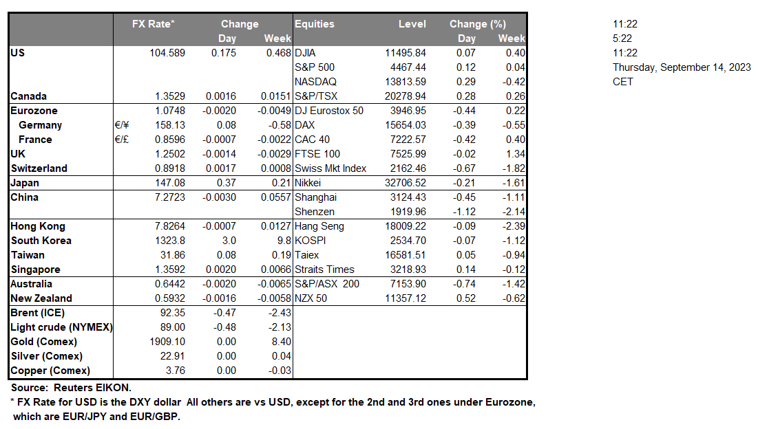 WTI prices rose yesterday, despite EIA showing an increase of US oil inventories implying that the tightness of the US oil market has eased. Should market worries for tightness for the supply side of the international oil market be maintained we may see oil prices rising further, yet there seems to be some fatigue among oil bulls and market worries for the economic outlook of China which in conjunction with inflationary pressures in the US economy may have an adverse effect on oil prices. The relative inactivity of Nasdaq was not interrupted even by the higher-than-expected US CPI rates. Today we highlight Arm’s IPO. The company is a British chipmaker and given the nature of its business and the size of the company it has attracted substantial interest among market participants and is expected to be the biggest IPO of the year.  Gold’s price remained relatively inactive, yet seems to be dropping and nearing the 1900 psychological threshold, a level coming to gold trader’s sights as any advancement of the USD tends to weigh, given the negative correlation of the two trading instruments.
