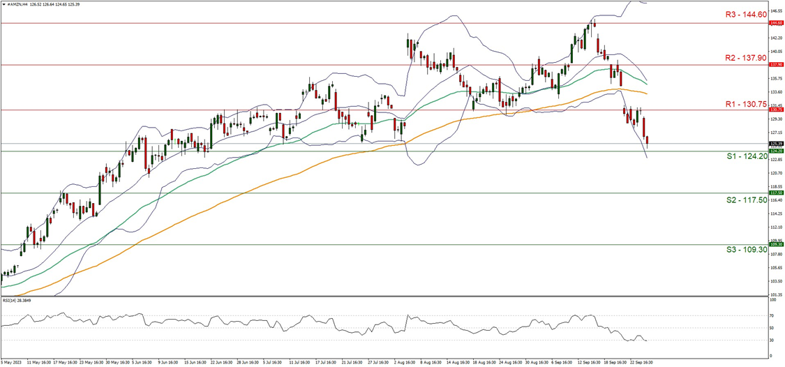 Amazon (#AMZN) appears to be moving in a downwards fashion, with the stock aiming for the 124.20 (S1) support level. The extreme widening of the Bollinger bands imply high market volatility in the market and as such the stock may be due for a slight market correction to higher ground, before potentially continuing on its downwards trajectory. Despite this, we tend to maintain a bearish outlook for the company’s stock price and supporting our case is the RSI Indicator below our 4-Hour chart which currently registers a figure of 30, implying a strong bearish market sentiment. For our bearish outlook to continue, we would like to see a clear break below the 124.20 (S1) support level, with the next possible target for the bears being the 117.50 (S2) support base. On the other hand, for a bullish outlook we would like to see a clear break above the 130.75 (R1) resistance level, with the next possible target for the bulls being the 137.90 (R2) resistance ceiling.