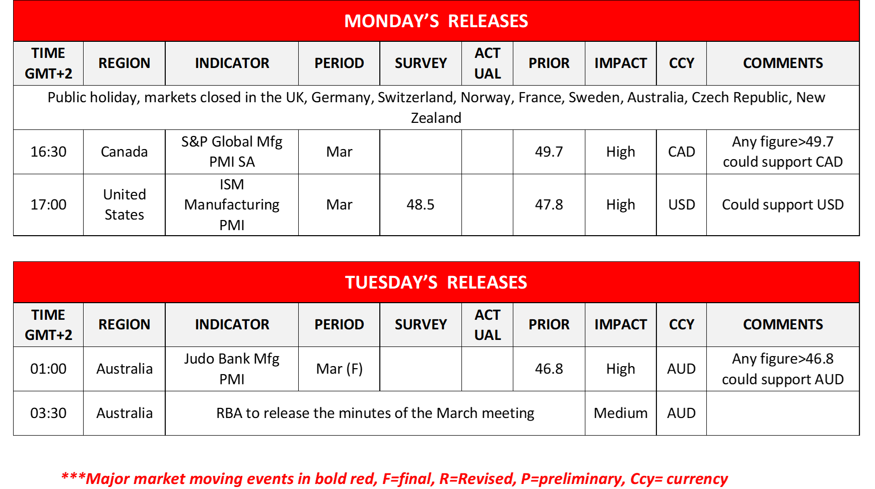 In todays’ American session, we get Canada’s S&P global manufacturing PMI figure for March and the US ISM manufacturing PMI figure for the same month. During tomorrow’s Asian session, we get Australia’s final manufacturing PMI figure for March, while on the monetary front RBA is to release the minutes of the March meeting.