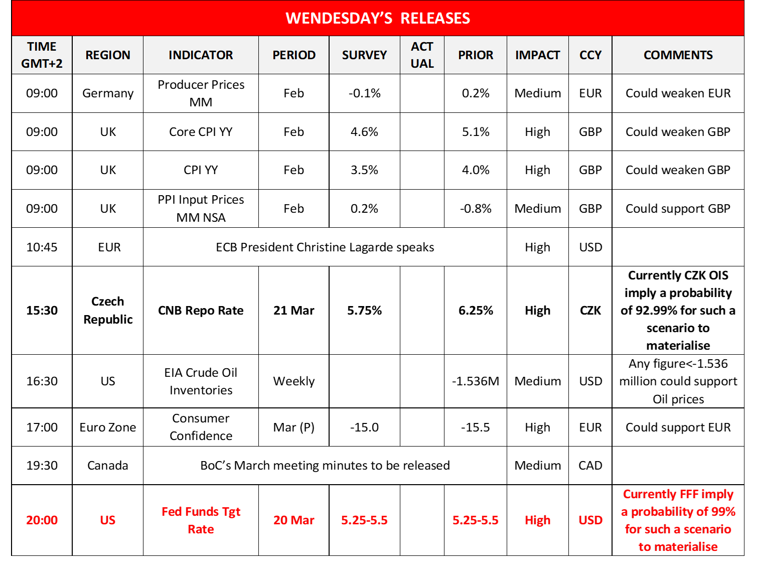 Today in the European session we note the release of Germany’s PPI rates for February, and we highlight UK’s CPI and PPI rates for the same month, while on the monetary front, we note CNB’s interest rate decision while ECB President Christine Lagarde speaks. In the American session, we get EIA’s weekly Crude oil inventories figure, Eurozone’s preliminary Consumer confidence for March and later on New Zealand’s GDP rate for Q4 and on the monetary front, besides the Fed’s interest rate decision we also note the release from Canada’s BoC March meeting minutes. On Thursday’s Asian session, we get Japan’s trade data for February and we highlight Australia’s employment data for February.