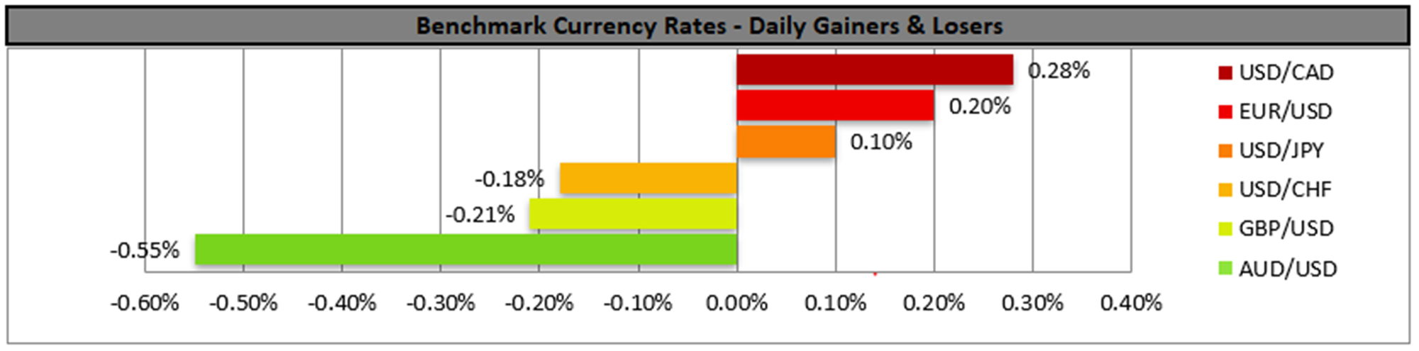 AUD/USD remained in a sideways motion between the 0.6620 (R1) resistance line and the 0.6515 (S1) support line. We tend to maintain our bias for the sideways motion to continue for the time being, yet note that the RSI indicator remained below the reading of 50 implying some bearishness in the market sentiment. Should a selling interest be expressed by the market, we may see the pair breaking the 0.6515 (S1) support line and aim for the 0.6400 (S2) support level. Should the pair find extensive buying orders along its path, we may see the pair breaking the 0.6620 (R1) resistance line and aim for the 0.6725 (R2) resistance nest.