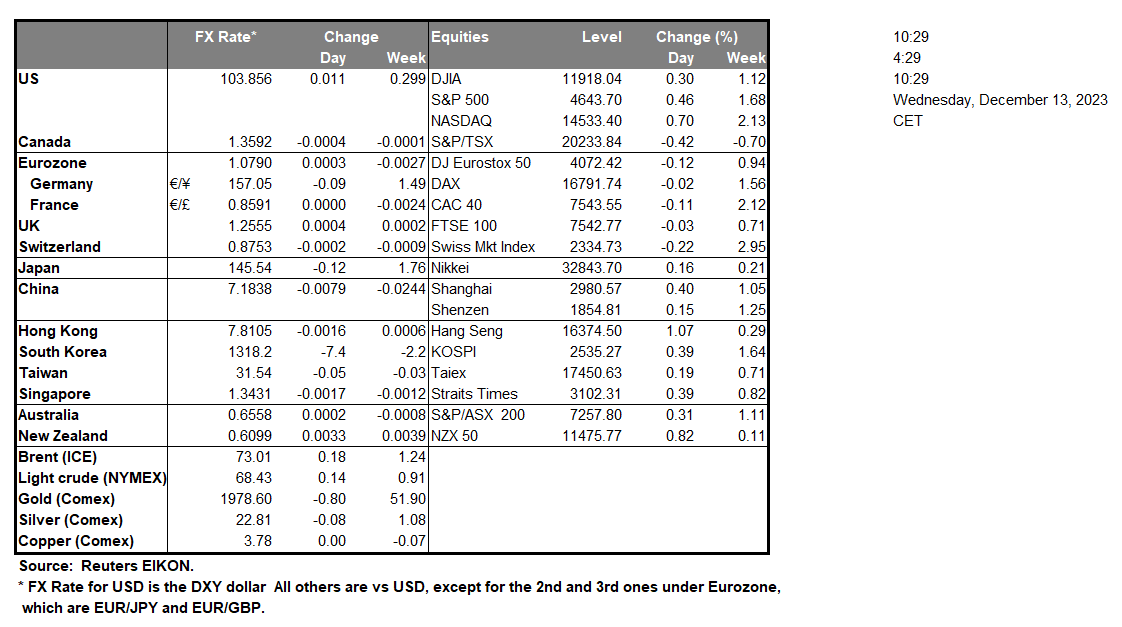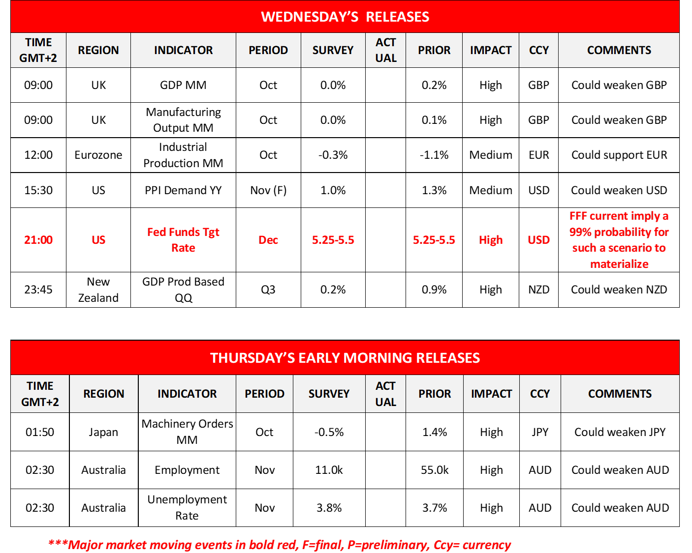 The USD tended to remain relatively unchanged against its counterparts yesterday and the market’s focus tends to turn towards the release of the Fed’s interest rate decision in the late American session today. The bank is widely expected to remain on hold keeping rates in the range of 5.25-5.50% and Fed Fund Futures (FFF) tend to imply a probability of 99% for such a scenario to materialise, rendering the interest rate part of the decision as an open and shut case for the markets. It should be noted that FFF also imply an expectation of the market for the bank to proceed with four rate cuts in the coming year, starting from May onwards. Attention is expected to shift towards the Fed’s accompanying statement and Fed Chairman Powell later on. Given the tightness of the US employment market as reported in November’s employment report and the persistent inflationary pressures as reported in November’s CPI rates, we tend to see the risks as tilted towards the hawkish side and if so, could provide some support for the USD. On the flip side should the bank opt to maintain a more cautious tone allowing for an intensification of the market’s expectations for extensive rate cuts, we may see the USD weakening. Thus we also highlight the release of the Fed’s new dot-plot, which is to show the Fed policymaker’s expectations about where rates are to land in the following year and 2025. Should the dot plot contradict the market sentiment and imply a slower pace in rate cuts than the market expects we may see some bullish tendencies for the USD and vice versa. Overall we expect the release to have ripple effects beyond the FX market and a hawkish Fed could have bearish tendencies on US equities markets as the decision may signal that tight financial conditions are to be maintained, beyond the market’s expectations, which could weigh especially on highly leveraged companies. A possible strengthening of the USD could also weigh on gold’s price, given the negative correlation of the two trading instruments and given that US bond yields may benefit from a possible hawkishness of the bank.