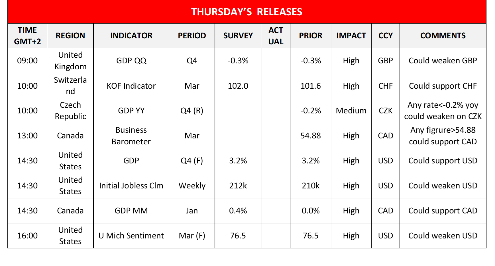 Today in the European session, we note from Switzerland, March’s KOF indicator and from the Czech Republic the revised GDP rate for Q4. In the American session, we get from Canada the business barometer for March and January’s GDP rate, while from the US the final UoM consumer sentiment for March.