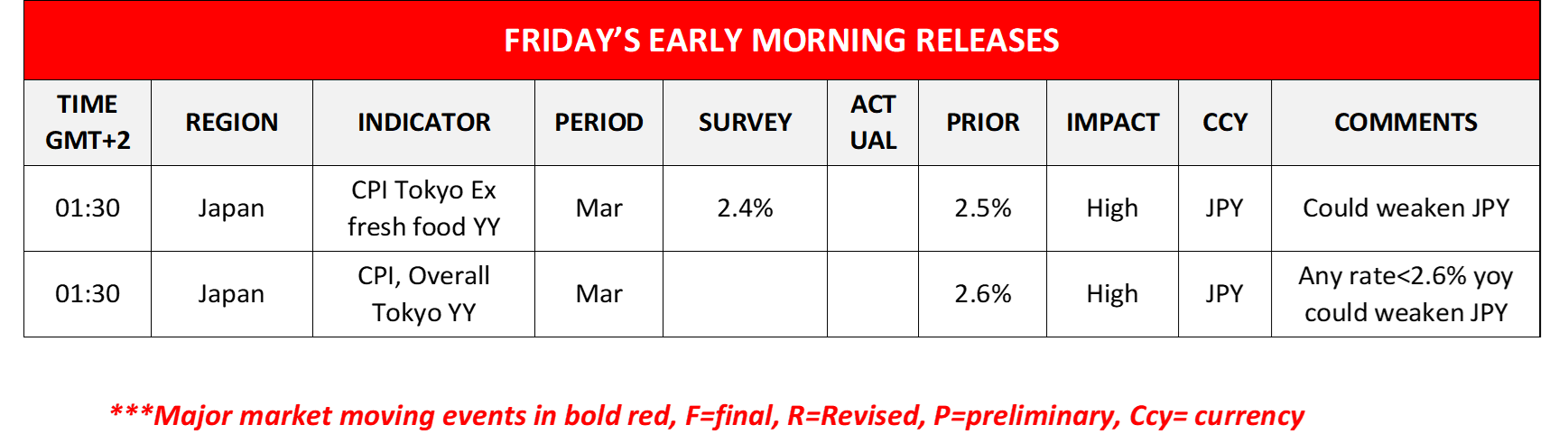 In the land of the rising sun, the release of BoJ’s summary of opinions for the March meeting tended to verify comments expressed by BoJ policymakers for a slow and long rate toward monetary policy normalization. The release had little effect on the JPY and on a fundamental basis the warning issued by Japan’s finance minister Suzuki, as mentioned in yesterday’s report, seems to keep the JPY in check, preventing it from further devaluation, at least against the USD. We note the release of Tokyo’s CPI rates for March tomorrow as important on a macroeconomic level, which may allow us to see the tendency of inflationary pressures in Japan, given the metropolis population density.