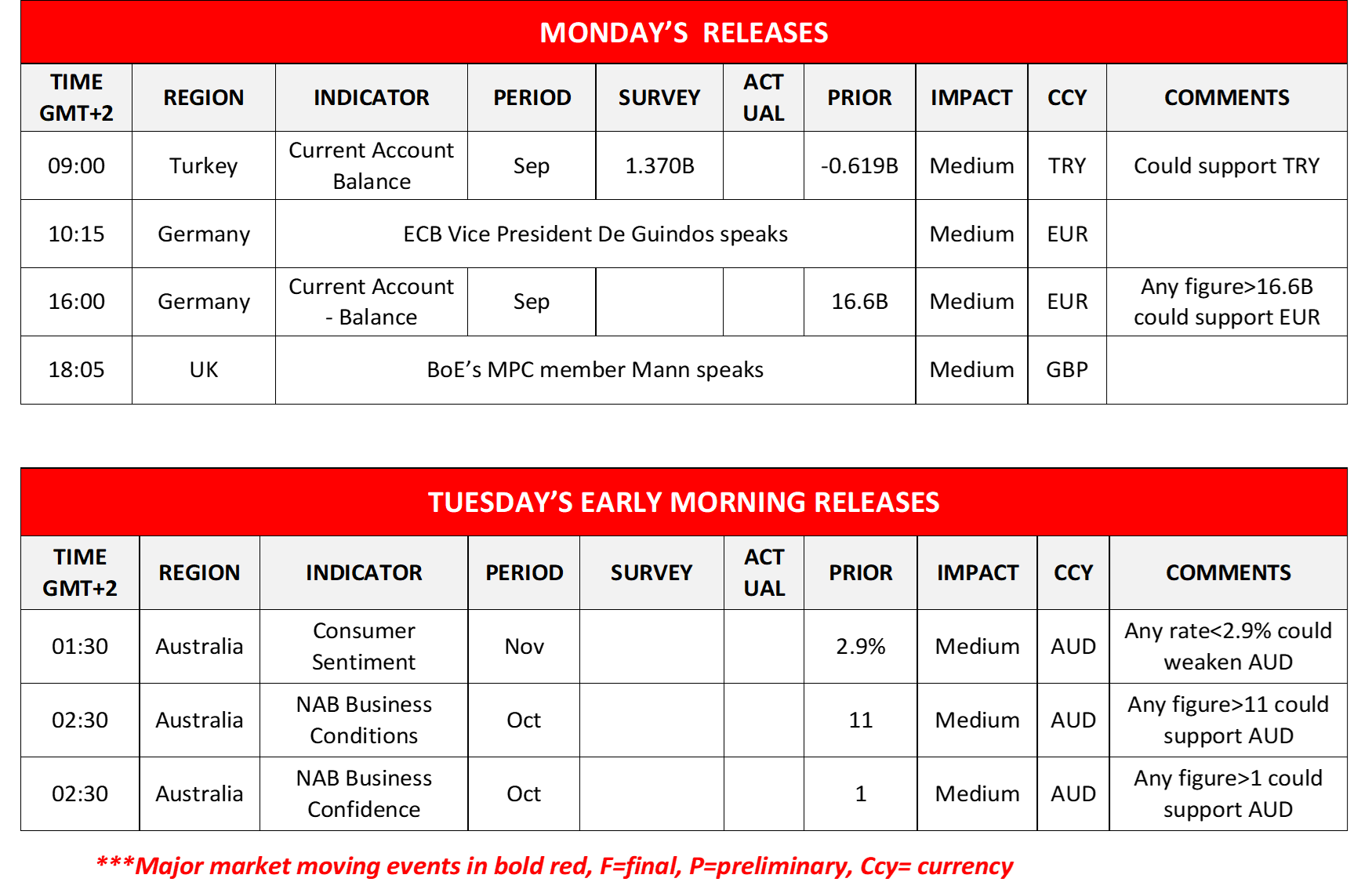 Today we note the release of Turkey’s current account balance for September and Germany’s current account balance for September while on the monetary front, ECB Vice President De Guindos and BoE’s MPC member Mann are scheduled to speak. During tomorrow’s Asian session, we get Australia’s consumer sentiment for November and October’s Business conditions and outlook indicators.
