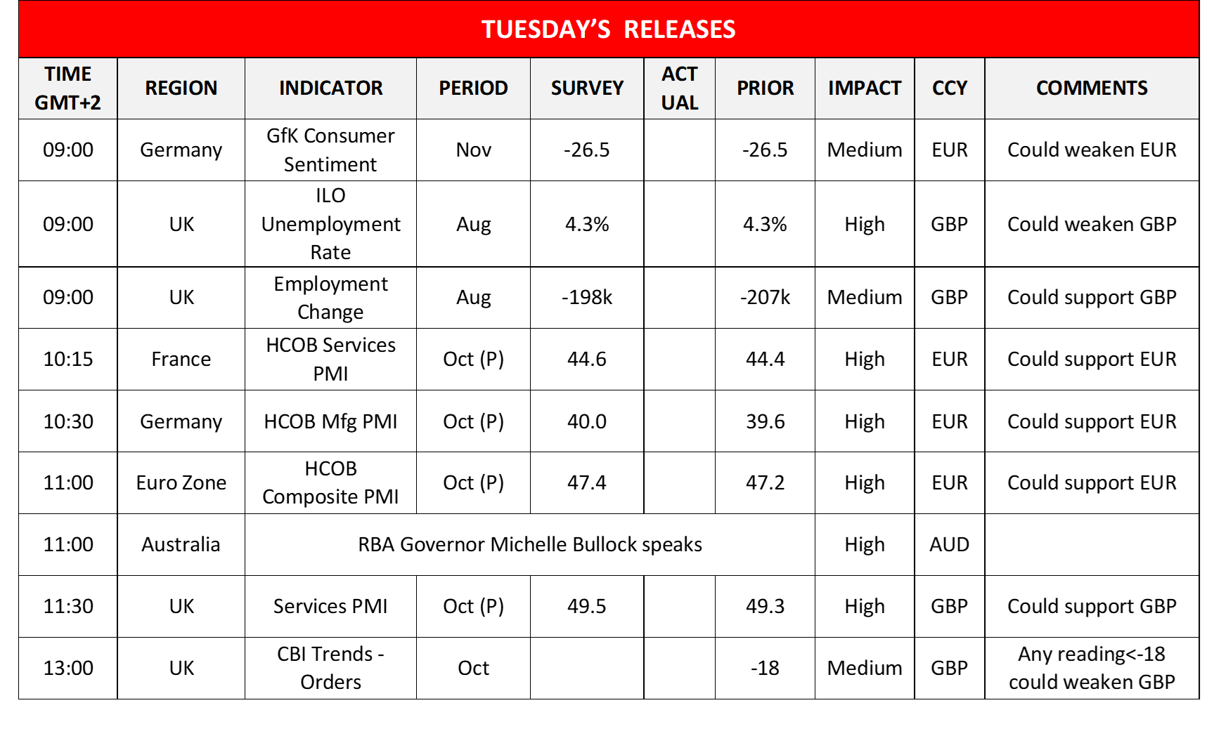 Today we highlight the release of the US preliminary October PMI figures, while oil traders may be more interested in the release of the US API weekly crude oil inventories. On the monetary front, ECB President Christine Lagarde is scheduled to make statements.