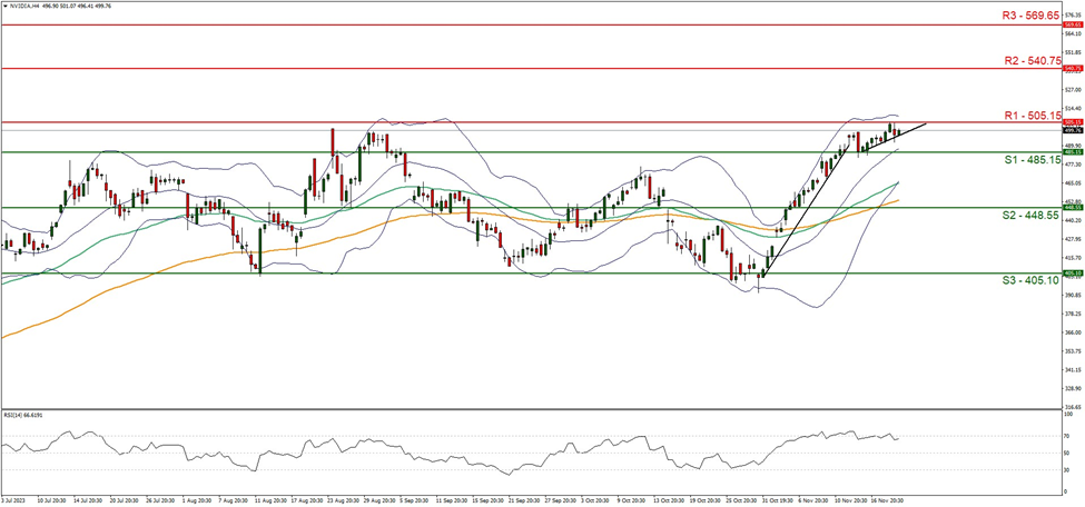 Nvidia appears to be moving in an upward fashion, having formed an upwards moving trendline on the 15th of November. We maintain a bullish outlook for the company’s stock price and supporting our case is the RSI indicator below our 4-Hour chart which currently registers a figure near 70, implying a bullish market sentiment. For our bullish outlook to continue, we would like to see a break above the 505.15 (R1) resistance level with the next possible target for the bulls being the 540.75 (R2) resistance level. On the other hand, for a bearish outlook, we would like to see a break below the 485.15 (S1) support level, with the next possible target for the bears being the 448.55 (S2) support base. Lastly, despite S1 and R1 being relatively close to one another, we may see the stock moving in a sideways fashion, should it remain confined in the narrow path set by the aforementioned S1 and R1 levels.