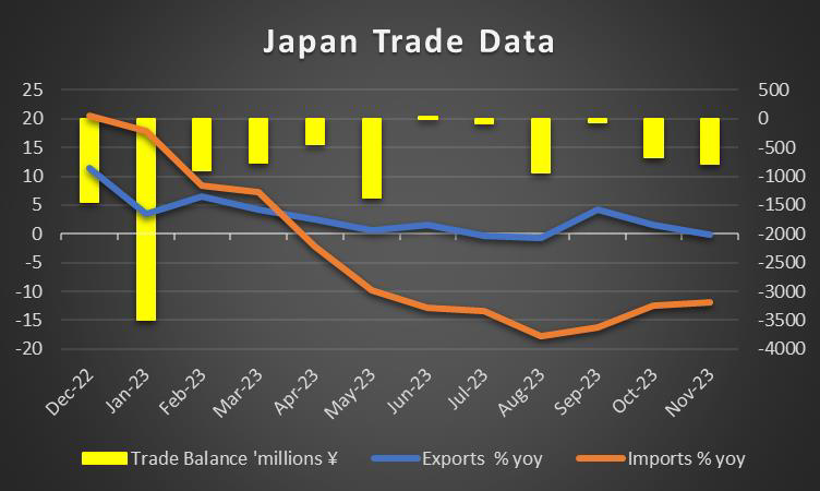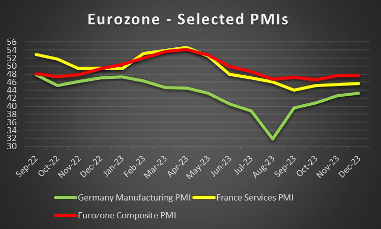 The EUR is about to end the week lower against the USD and GBP, yet gains ground against the JPY. On a fundamental level, we tend to maintain our worries about the political outlook of Germany, given the protests of farmers but also the rise of the AfD. The recent scandal of a conspiracy for the deportation of two million immigrants may have been ringing the alarm for Germany politically, yet the far-right movement seems to remain strong and the elections are nearing. On a macroeconomic level, we make a start by noting that Eurozone’s industrial production suffered an even deeper contraction for November, being another signal of the sufferings of the sector. Furthermore, the outlook for Germany tended to be more optimistic in January, yet conditions on the ground for the largest economy in the Eurozone, seem to have deteriorated slightly. We also note that the acceleration of the Eurozone’s HICP rate for December was confirmed, a scenario that may force the ECB to keep a harsher rhetoric in its coming meeting on Thursday. The bank is widely expected to remain on hold keeping the refinancing rate at 4.5% and the deposit rate at 4.00%. It’s characteristic that EUR OIS imply a probability of 96% for such a scenario to materialise, which more or less tends to set the interest rate part of the decision as an open and shut case. Market focus is then expected to shift towards the release of the accompanying statement and a bit later towards ECB President Lagarde’s press conference. Please note that the market expects the bank to deliver six rate cuts in the current year, starting from April onwards. Yet, given President Lagarde’s recent statements it seems that the bank is orienting itself towards starting to cut rates by the summer, but at the same time seems ready to take its time to proceed with the first rate cut, as it wants to be more certain that inflation has returned to target. On the other hand, the Eurozone is facing a recession, which in turn increases the pressure on the bank to start cutting rates rather sooner than later. It will require a very fine balance in the accompanying statement and President Lagarde’s press conference in order not to affect the common currency and it may be difficult for such a fine balance to be achieved on Thursday. Should the bank seem to be in more of a hurry to start cutting rates, we may see the EUR weakening and vice versa.