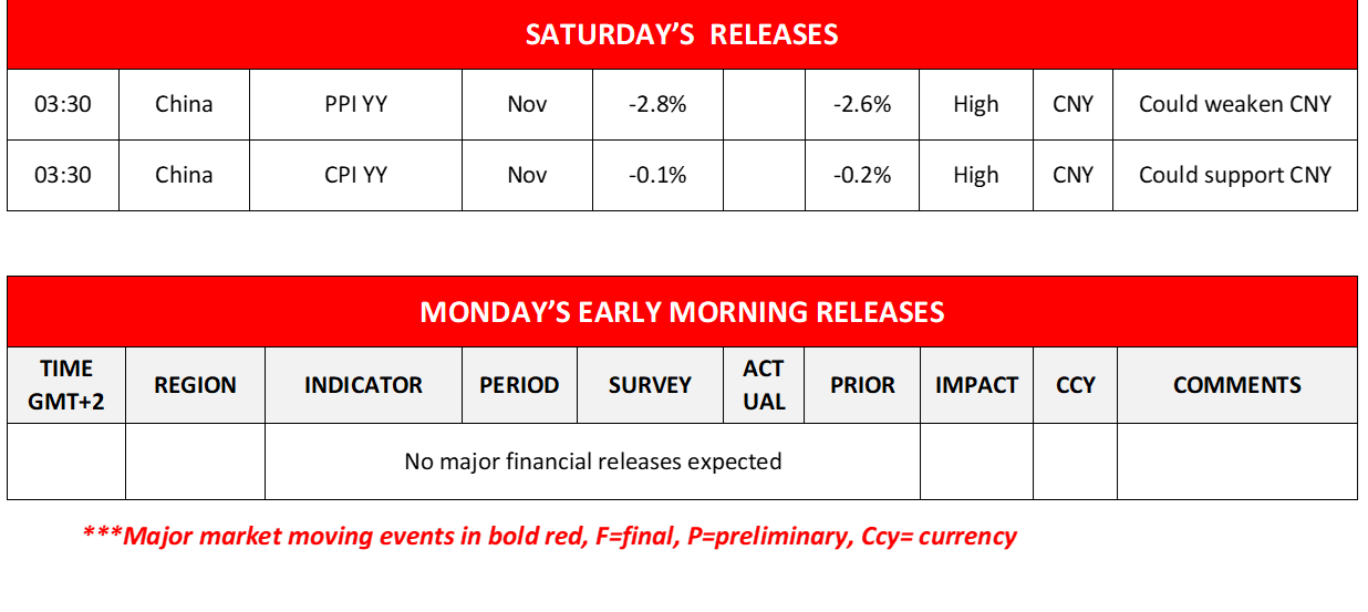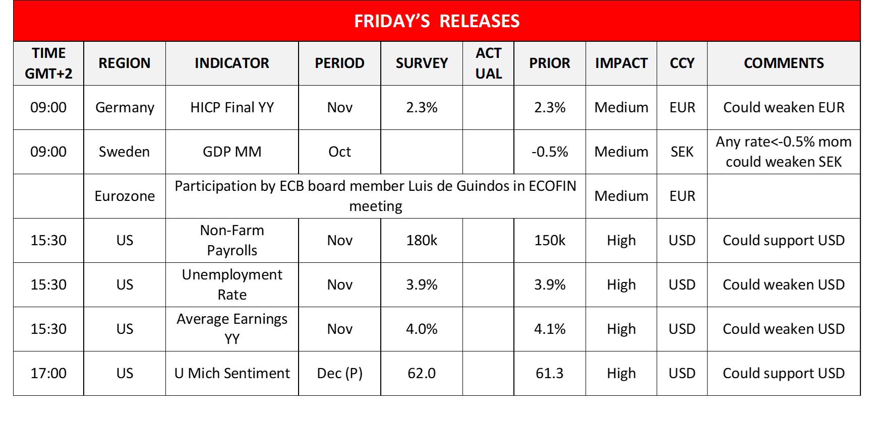 Today in the European session, we get Germany’s final HICP rate for November and Sweden’s GDP rate for October, while ECB Vice President De Guindos is to take part in the ECOFIN meeting. In the American session, besides the US employment report for November, we also get from the US the preliminary University of Michigan consumer sentiment for December. On Saturday we note the release of China’s November inflation metrics.