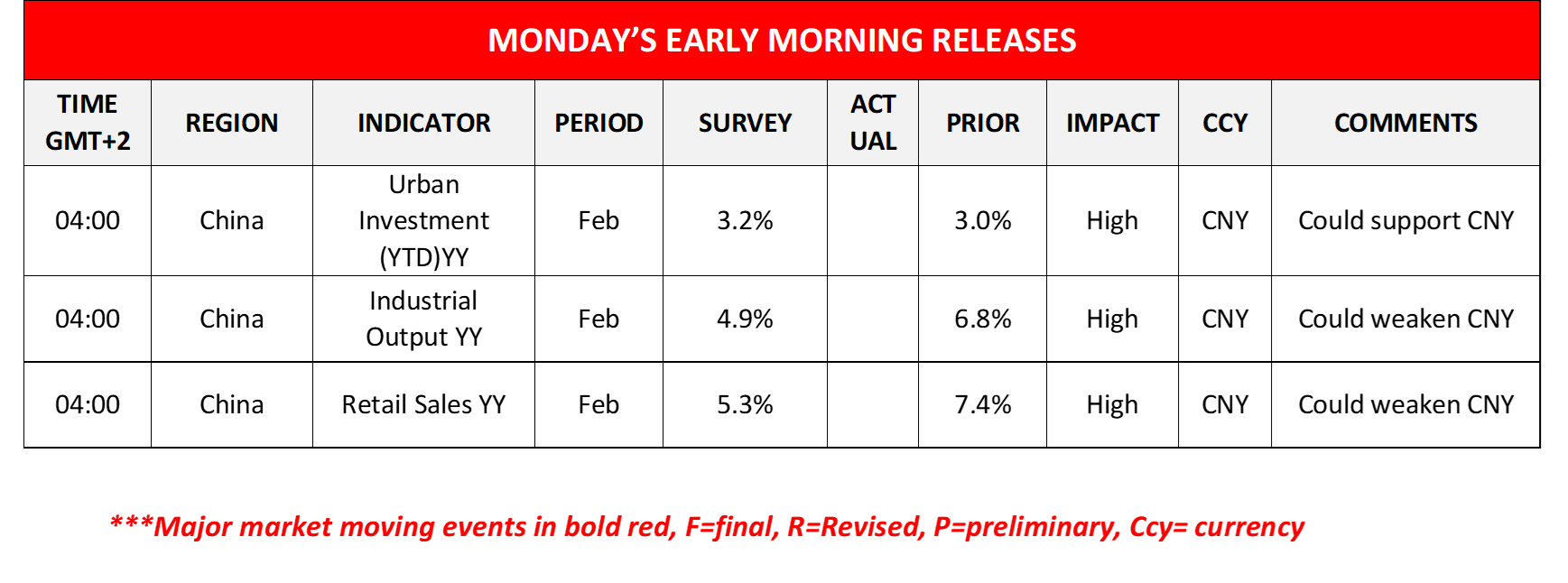 During Monday’s Asian session, we note the release of China’s industrial output, retail sales and urban investment growth rates all being for February. The release is expected to keep Aussie traders on the edge of their seats, given the close economic ties of Australia with China. A possible slowdown of the industrial output growth rate could imply a wider amount of raw materials exported from Australia to China, while an acceleration of the Urban investment growth rate could ease somewhat market worries for the much-troubled Chinese construction sector.